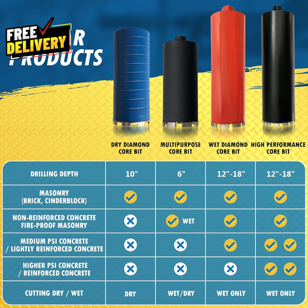 Store New Arrivals Add to Favorite View Feedback Contact 3 Wet Drill Core Bits for Concrete and Hard Masonry 10Mm Segment Height 14 D... Description MULTIPURPOSE - designed to drill concrete, concrete with light steel reinforcement or hard masonry HEAVY DUTY - embedded diamond concentration guarantees longer core life and efficient drilling ARBOR SIZE - 1-1/4"-7 threaded arbor DRILLING DEPTH - 14" drilling depth WET/ROTARY MODE ONLY - recommended to use with handheld core drills or dedicated core drill rigs (rotary mode only, no wire mesh drilling) Item model number WBP0300A4 Material Diamond Cutting Angle String 6E+1 Degrees Product Dimensions 17.52 x 3.39 x 3.39 inches; 1 Pounds Shank Type Straight Cutting Diameter 3" Inches Finish Type Diamond Coating Size 3 Inch ABOUT US Prior to making any purchase from our store, we’d like to introduce ourselves. My name is Shahzad Yaqub , and I am the proud owner of Epic Emporium Deals , located in the great state of Illinois, USA. I have been an active and trusted eBay seller since Jan 14, 2025 . At Epic Emporium Deals , we are committed to offering competitive prices and top-quality products . Our extensive collection features a wide variety of items, including media such as books, movies, music, and games , as well as electronics, toys, sporting apparel, clothing, tools , and general home and garden essentials —and much more! If you have any questions or require assistance, please don’t hesitate to reach out. Your satisfaction is our priority, and we look forward to providing you with an exceptional shopping experience. SHIPPING We are always working hard to ensure your package arrives as soon as possible. Please understand that some factors like weather, high postal traffic, and the performance of shipping companies are outside of our control. We offer free shipping to the lower 48 states and ship within 2 business days of payment, usually sooner. We do not accept P.O. Boxes. Please provide a physical address. For shipping outside of the continental USA, we only use eBay's Global Shipping Program. The item is shipped to IL and then sent to the rest of the world. International customers are responsible for all duties and taxes. Continue to 'check out' to calculate costs for shipping the item to your country. Messages regarding eBay's Global Shipping Program MUST be directed at eBay EXCLUSIVELY. RETURNS We do not accept returns under normal circumstances. However, we will gladly consider a return if the item is received broken or if the wrong size is sent to you. In all other cases, returns will not be accepted. CUSTOMER SATISFACTION We try our very best to make sure every customer is completely satisfied. If there's a problem, message us! We're happy to help.