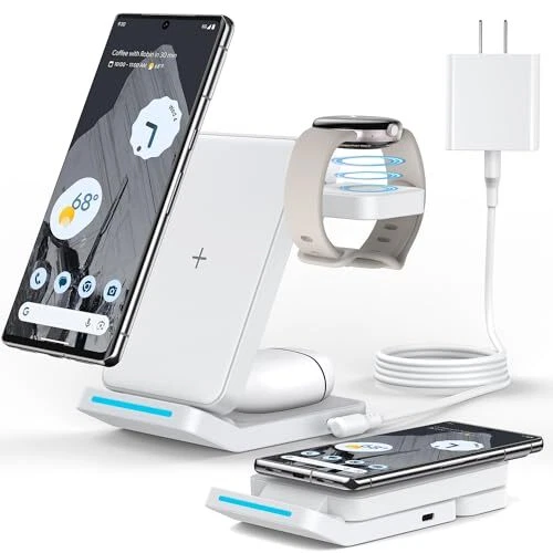 3 in 1 Foldable Wireless Charger for Google Pixel Watch 2, Charging Stand for Pixel 9 Pro/9 Pro XL/9/8 Pro/8a/8/7/Pro/7/6/Pro and Pixel Buds Pro/2, Charging Station with QC 18W Adapter, White