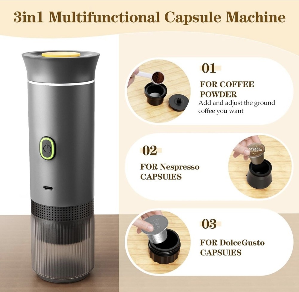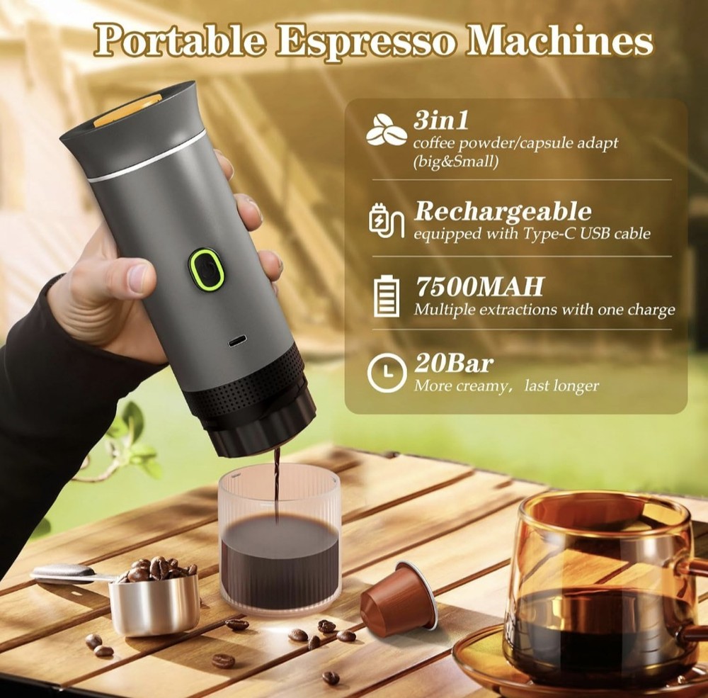 Excellent condition. Used for a weekend. 【Multifunctional 3-in-1 Espresso Machine】The portable espresso maker is ingeniously designed, and in addition to being compatible with ground coffee, it also supports large and small capsules (NS & DG capsules). Whether you prefer traditional ground coffee or the convenience of capsule coffee, the mini coffee maker can be perfectly adapted to meet different tastes and needs. 【Lightweight & Portable】Portable espresso machine weighs only 680g. You only need the space of a water cup to carry it, making it easy to carry around and perfect for camping, traveling, and hiking. The portable espresso machine it has a sleek design with a modern Type-C charging port that supports in-car charging and USB charging, making it suitable for camping, travel, hiking, and office use. 【Premium Battery Capacity】 The travel coffee maker comes with a 7500mAh battery, and a modern Type-C charging port that supports in-car and USB charging, meeting your needs for multiple daily uses. Portable coffee maker supports 5 cups of coffee using 1.7 ounces of room temperature water at 77°F, and over 200 cups using hot water. 【Self-Heating Function&Powerful Pessure】This portable coffee maker has a self-heating function With just a gentle tap, you can enjoy the perfect espresso in 5 minutes.No additional equipment or complicated preparation steps are required.Portable coffee machine with a 20Bar pressure pump.The high-pressure pump simulates the brewing technique of a professional barista, ensuring that each cup of coffee achieves a full-bodied flavor and perfect layering.