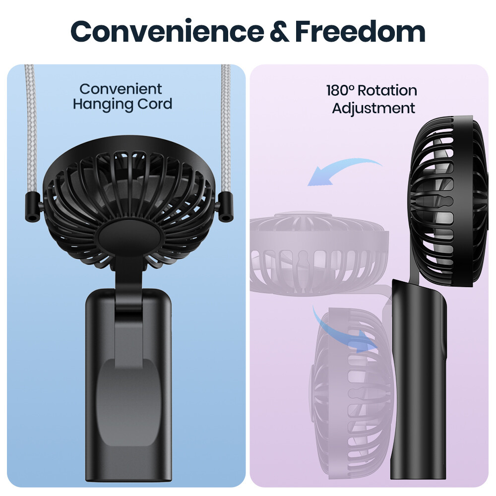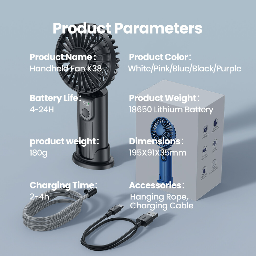 Description 【Extended Battery Life】The portable fan features a built-in 5000mAh high-capacity battery and energy-saving technology, providing long-lasting battery life and energy efficiency. With a runtime of 7-24 hours , you can enjoy a cool and comfortable day without worrying about running out of power. Perfect for travel, makeup, eyelashes, camping, outdoor activities, and indoor use, this mini portable fan is a must-have. 【3-in-1 Multifunctional Fan】Not only is it a handheld fan, but with a 180° foldable angle, it can also be used as a desktop fan. In addition, you can use it as a neck fan with the provided lanyard, freeing your hands and making it convenient to carry while traveling. 【Quiet Operation and 4 Adjustable Speeds】The personal fan is equipped with a high-quality brushless motor and advanced silent motor technology, which reduces noise while maximizing airflow. With 4 adjustable speeds, you can easily switch between different levels of airflow, keeping you cool and comfortable whether you are working, sleeping, or relaxing. 【Smart Digital Display】This mini fan is equipped with a smart digital screen that displays the current wind speed and remaining battery power. This allows you to adjust the fan to your desired speed level and know when it needs to be recharged, avoiding running out of power when you are outdoors. 【Convenient Portability】The fan is lightweight and portable, measuring only 19.5*9.1*3.5cm. It is suitable for various occasions, whether you are at home, in the office, traveling, or camping. It can easily fit into your bag or backpack, allowing you to enjoy a cool and comfortable experience wherever you go. Package includes 1 * Portable Mini Fan 1 * USB Charging Cable 1 * Manual 1 * Base Product Highlights Type: Handheld fan Body size: 19.5*9.1*3.5cm Color: Black Power: 2.5W Battery: 5000mAh lithium battery Input voltage/current: 5V/2A Charging interface: Type-C