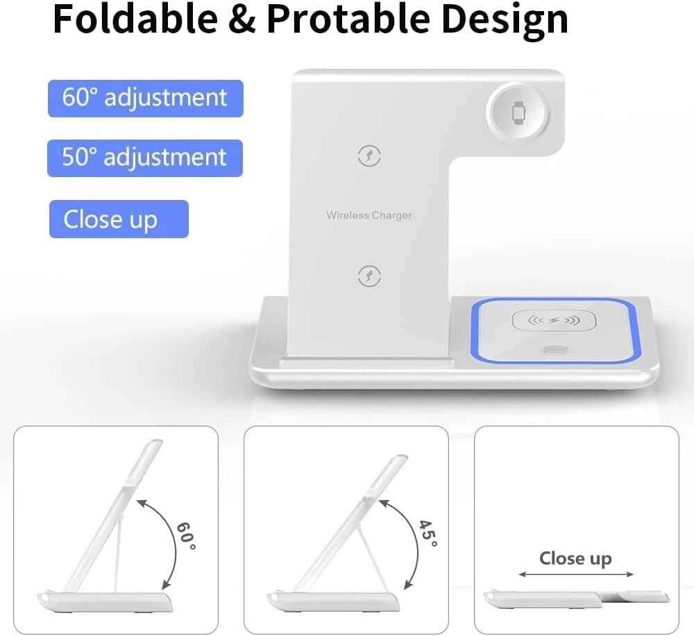 3-in-1 Wireless Charging Station: You can charge your apple products simultaneously with this 3-in-1 wireless charger stand. It charges your iPhone, iWatch and AirPods at the same time.Powered by QC3.0 adapter (INCLUDED), the charging stand outputs up to 10W for phones, 5W for AirPods, 2.5W for iWatch. . Safe Wireless Charger: The fast wireless charging station provides you a safe charging experience. It adopts over-current protection, over-voltage protection, over-charging protection techniques, and massive heat dissipation holes, ensuring your charging safe & secure. . Adjustable & Foldable Charging Stand: Designed for your convenience, this wireless charging station is adjustable with 2 gears and foldable for carrying around. You can also charge your phones vertically while browsing apps (Instagram, TikTok, Facebook, etc.) and horizontally while watching movies. It suits your office desk, end table, and bedside desk perfectly. . Advanced smart protection: The 3 in 1 wireless charger uses high-efficiency components and advanced chipsets, and the dual-coil design greatly improves the charging speed of the device. Control, foreign body detection, etc, you and your products will be fully protected. . No longer need a lot of wires: The 3 in 1 wireless charging station can reduce your charging cable on your desk for different devices, only need one cable, save place and look neatly. Easily install and conveniently to use. Just put your device in the right charging place and insert the cable. Features Specifications: Input Voltage/Current: DC 9V-2A Wireless Output for Phone :5W/ 7.5W/10W /15W Max. Wireless Output for Airpod: 5W Max. Wireless Output for iWatch: 2W Max. Material: ABS+PC Fireproof Material What You'll Get 1*3 in 1 Wireless Charger 1*Type-C Power Cable 1*QC3.0 adapter 1*User Guide Compatible Models: 10W Fast Charge Mode (with Quick charge 3.0 adapter) - Samsung Galaxy S25/S24 /S23/ S21/ S20/ S10/ S10 Plus/ S10e/ Note 10 - Samsung Galaxy S9 Plus/ S9/ Note 9 - Samsung Galaxy S8/ S8 Plus/ Note 8 - Samsung Galaxy S7/ S7 Edge/ S6 Edge Plus/Note 5 7.5W Fast Charge Mode for iPhone series: iPhone 15/15 Plus/15 Pro/15 Pro Max iPhone 14 Pro/14 Plus/14 Pro/14 Pro Max iPhone 13/13 Plus/13 Pro/13 Pro Max iPhone 12/12 Plus/12 Pro/12 Pro Max iPhone 11/ 11 Plus/11 pro/ 11 Pro Max/ XS/ XS Max/ XR/ X/ 8/ 8 Plus (Not for iPhone 12 Mini/13mini) 5W standard charging (Using 5V/2A adapter): all wireless devices. Apple Watch Series SE/ 9 / 8 / 7 / 6/ 5/ 4 / 3 / 2 / 1 and Other Wireless Devices. AirPods 2/3/Pro/Pro 2(Wireless charged,do not need extra cable). Specification: Input:12V/2A, 9V/2.7A Phone Output:15W-7.5W-10W-5W Earbuds output: 2.5W Conversion efficiency: 73% Specification and size: 5.35*4*5.35 inches