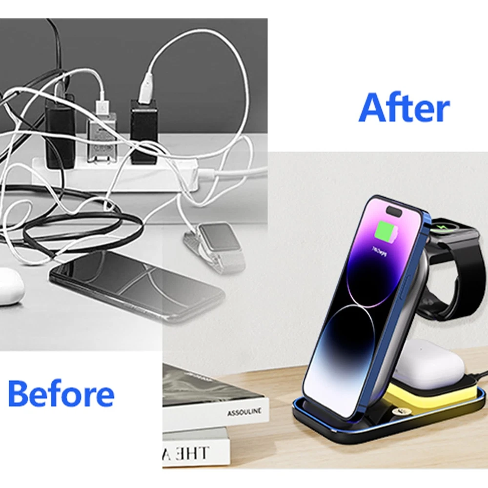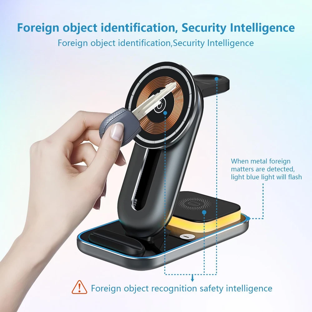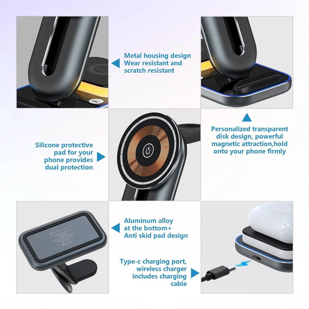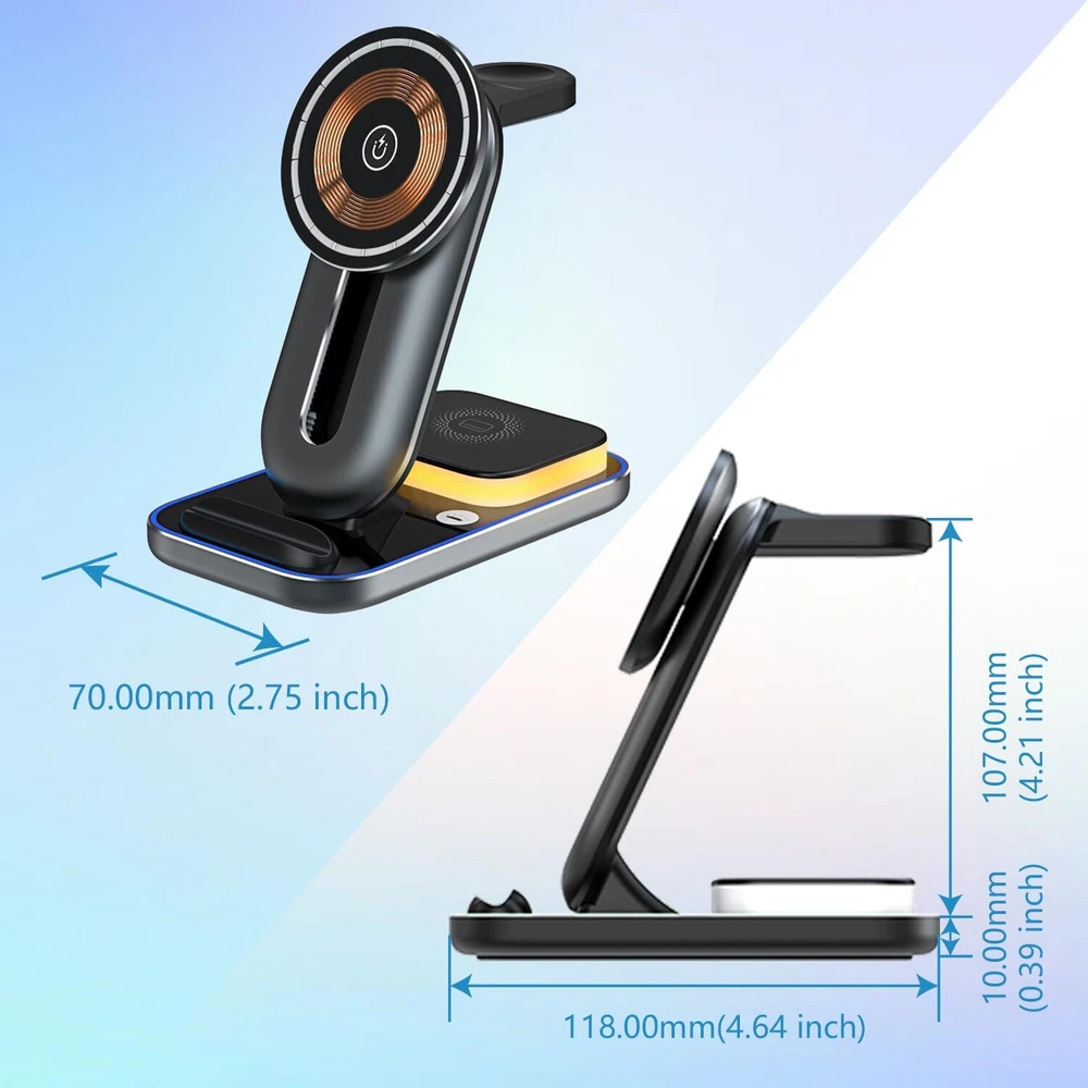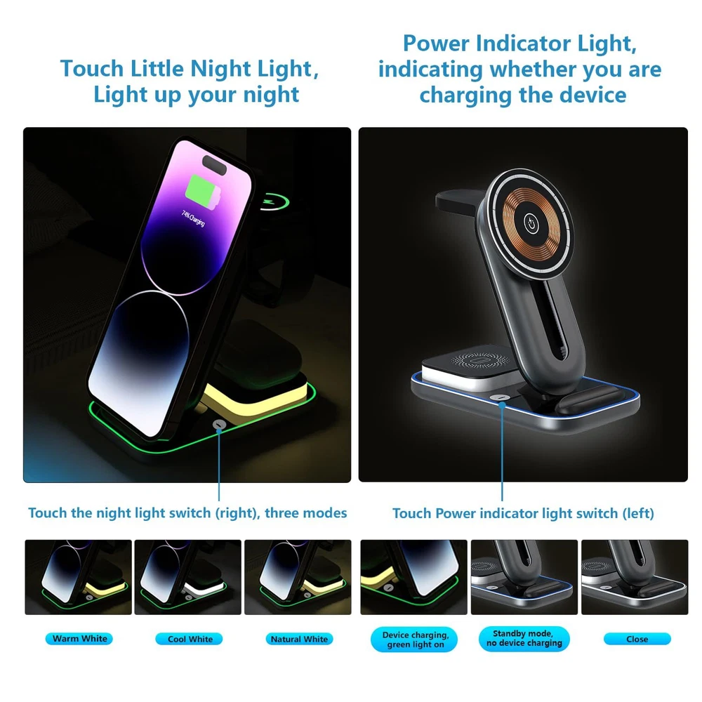 【3 in 1 Magnetic Wireless Charging Station】: Our 4 in 1 wireless charging Docking can charge for iPhone 12&13&14&15 series, apple watches and Airpods simultaneously, also has night light function,needn't for extra chargers for each item. Say goodbye to the messy cords and redundant cables that make your desk and nightstand neat and organized. 【Multi-function Charging Stand】: 15W Fast Magnetic Wireless Charger only takes about 2-3 hours to give your cell phone, watch, and earbuds a full charge. This mobile phone wireless charging station supports 360 ° fixed and slides up and down, it have Silicone base, keep your devices from scratching, rubber pads, and feet protect your device from sliding. 【Multi-protection Design】: The fast wireless charger with over-current protection, over-voltage protection and over-temperature protection as well as foreign object detection function, can prevent over-charging damage of equipment battery. No worries about the damage to your devices and battery life. 【Adjustable Night Light】: The wireless charging dock station with the design of Three-mode light colors, such as warm light and Cold light, natural light, can adjust the light color freely. If you want to turn off or turn on the light, just touch-sensitive key. Light helps you find your phone easily at night.(You will get 1*Magnetic Wireless Charger station, 1*USB Type-C Cable, 1*User Manual, 1*15W QC 3.0 Adapter.) 【Compatibility】: The wireless charging station with a Type-C port to support 3 devices charge simultaneously. Fast Charging Compatible for iPhone 15&14&13&12 series and for Mag-Safe case, for Airpods all series, for iWatch Series 7/ 6/ 5/ 4/ 3/ 2/ SE. (Note: Please connect the USB C port before charging devices).100% satisfaction guarantee! If you are not completely satisfied with our magnetic wireless charger, you can get a refund or a replacement within 24 hours. You will get 12-month warranty.