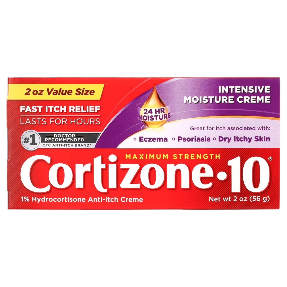 Maximum-strength itch relief without a prescription that works fast and lasts for hours while also providing skin with 24-hour moisture. Cortizone 10 Maximum Strength Intensive Moisture Anti-Itch Cream relieves itch fast and lasts for hours. Formulated with maximum-strength hydrocortisone, this anti-itch cream nourishes and hydrates skin while relieving itch with seven moisturizers and three vitamins. Use it on minor skin irritations, rashes, insect bites, and poison ivy and sumac. Cortizone 10 Intensive Moisture Cream provides 24-hour moisture in a fragrance-free and dye-free formula. No wonder it's the No. 1 doctor-recommended anti-itch brand among topical analgesics. Contains: One (1) 2-oz. tube of Cortizone 10 Maximum Strength Intensive Moisture Anti-Itch Cream Fast relief of itch associated with minor skin irritations like rough, dry, chafed and chapped skin Formulated with seven moisturizers, plus vitamins A, C, and E to nourish and hydrate skin Features 1% hydrocortisone, the maximum-strength itch relief without a prescription Relieves itch in under 10 minutes and lasts for hours Cortizone 10 anti-itch cream with 24-hour moisture is gentle on skin, fragrance free and dye free Cortizone-10 is the #1 Doctor-Recommended OTC Anti-Itch Brand