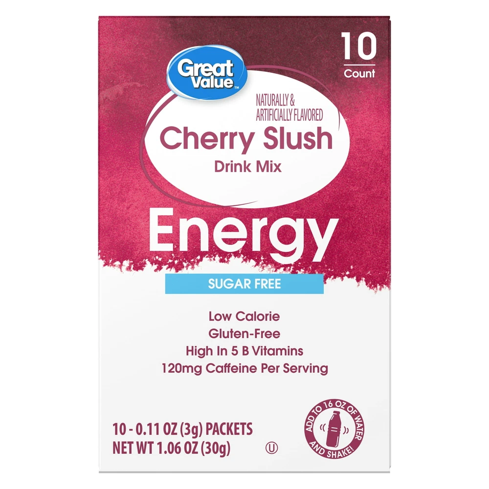 About this item Product details Each box of Great Value Cherry Slush Energy contains 10 Singles To Go and is a naturally and artificially flavored, low calorie drink mix containing zero sugar, and is gluten free and Kosher. High in 5 B Vitamins. Contains 120mg Caffeine Per Serving. Contains 120mg Caffeine Per Serving. Zero Sugar, Low Calorie, Kosher and Gluten Free Drink Mix. Each serving is high in five B Vitamins. Easy to Make SIP from a full bottle of water to make room for powder