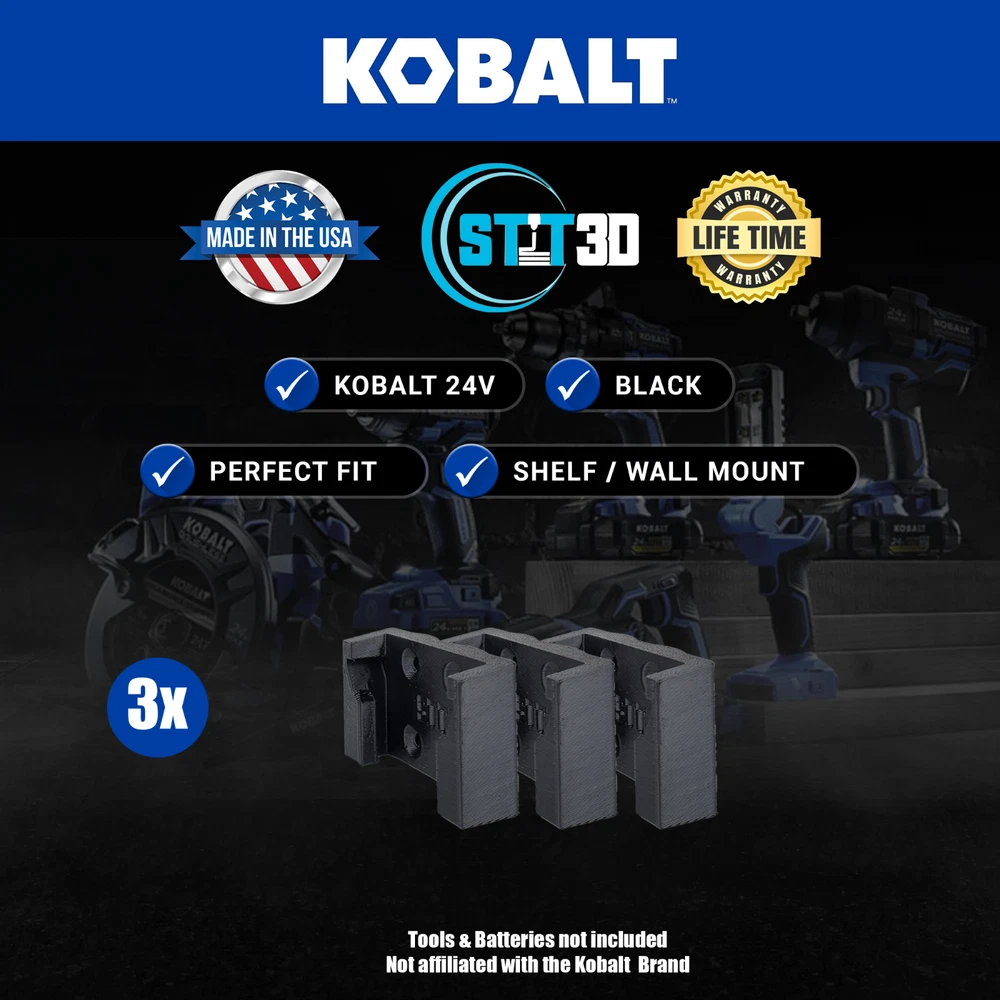 3 pack Kobalt 24 volt / battery holder / Hanger / shelf mount 3d printed Black