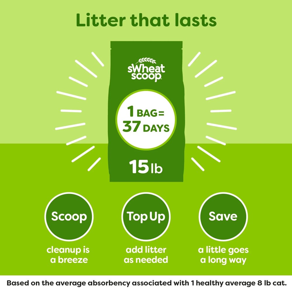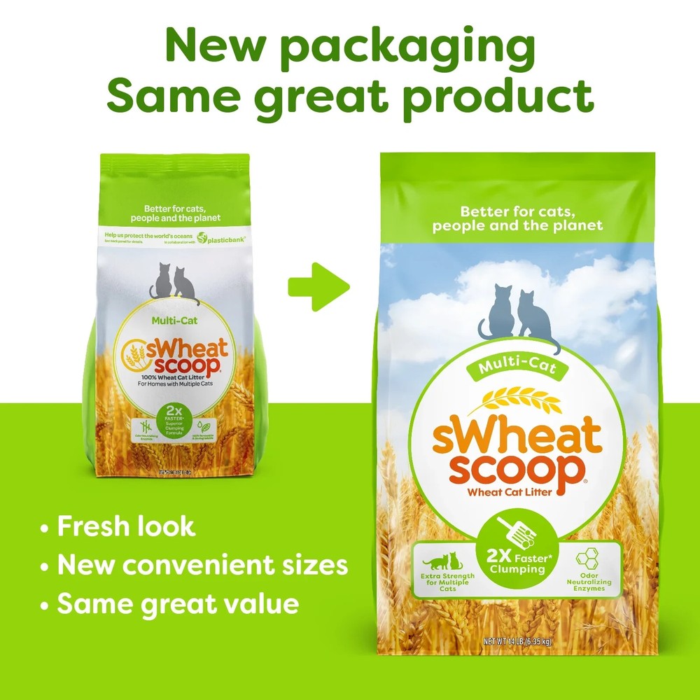 Multi Cat Litter: Formulated with our proprietary natural wheat blend, sWheat Scoop Multi-Cat clumps even faster, scoops easily, and smells like a fresh wheat harvest. And because wheat is virtually dust-free, tracking is minimal and clean-up is a breeze-a must for homes with multiple cats! Original: Created over 25 years ago on a family farm, sWheat Scoop is the world's original plant-based litter Natural: Made with nothing but wheat Unscented: Made with no added dyes, perfumes, or chemicals Dust-Free: 99.5% dust free Flushable: Easy-to-flush clumps