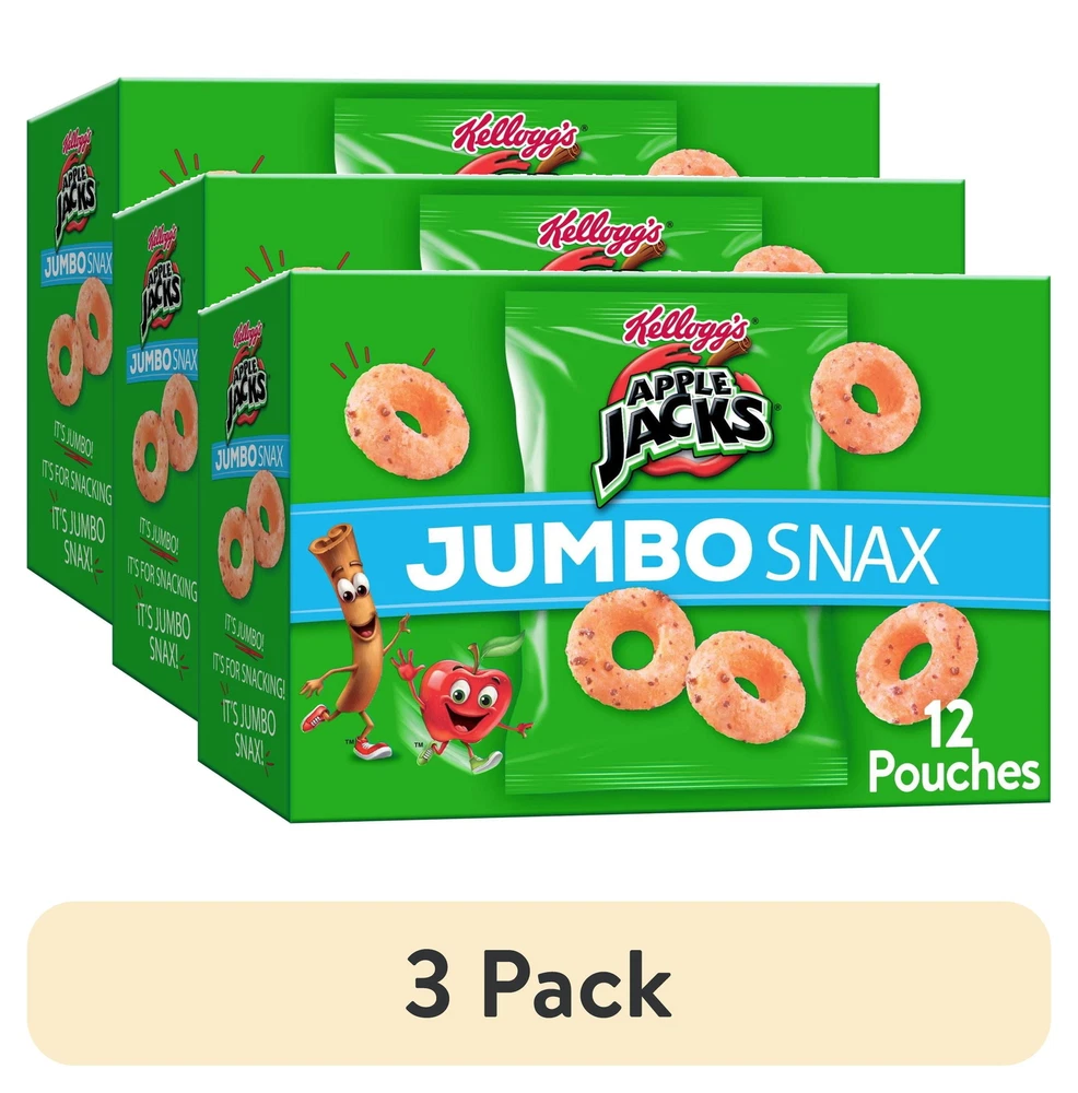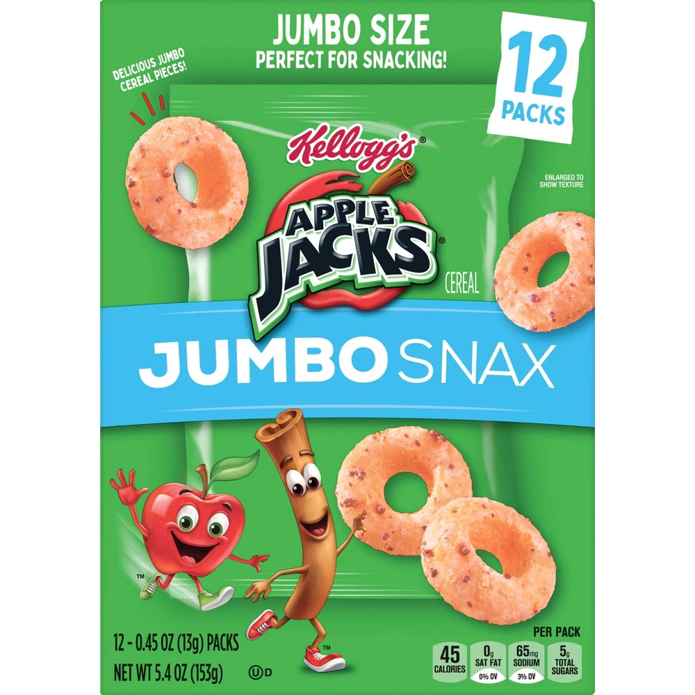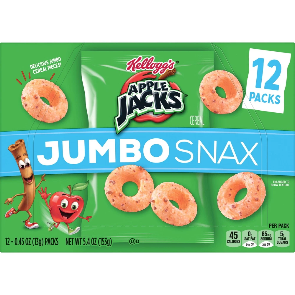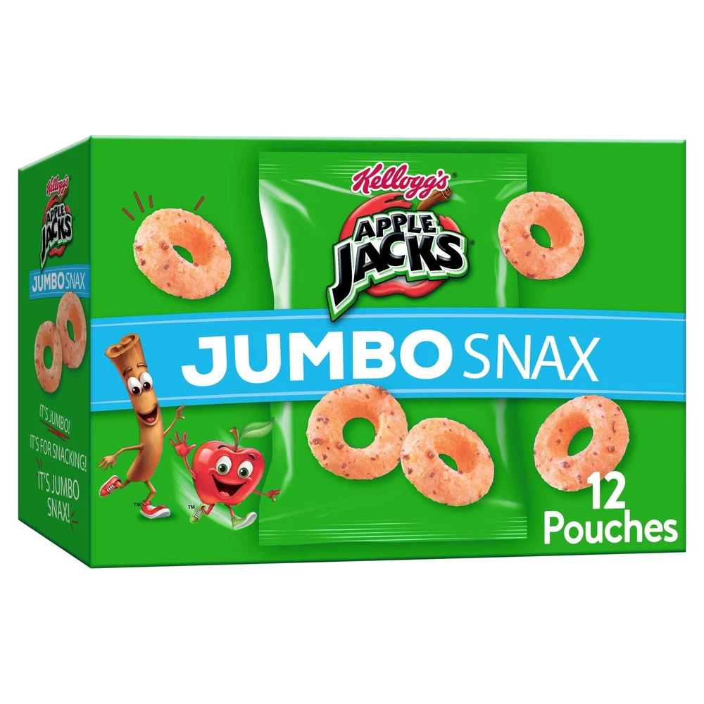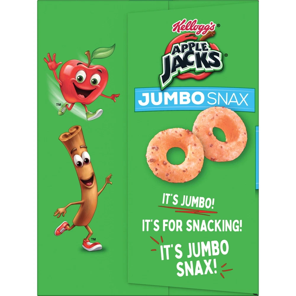 Now jumbo-sized, your favorite cereal brand is packaged perfectly for on-the-go snacking. This convenient multi-pack 5.4oz box includes 12 pouches of Kellogg's Jacks Jumbo Snax, which makes it easy to enjoy these jumbo multigrain Os and the delicious flavor of and cinnamon anytime, anywhere. Jumbo Snax are perfect for lunchboxes, a mid-morning pick-me-up, or after school snacks. Pack a pouch in your backpack or gym bag to enjoy after practice or sporting events. Take with you in the car for the perfect road-ready snack. Wherever life takes you, Jumbo Snax pouches are made for busy, on-the-go moments. More than just convenient, Jacks Jumbo Snax is made with the goodness of wholesome grains and no high fructose corn syrup; it's a crunchy, sweet treat you can feel great about. Make everyday moments more fun with your favorite cereal, now jumbo-sized and packaged perfectly for snacking anytime, anywhere The entire family will love the jumbo-sized wholesome grain Os and the delicious flavor of and cinnamon A tasty, wholesome cereal snack that contains no high fructose corn syrup Perfect for both kids and adults; Pack in lunchboxes, tote bags, or in the car; Makes a delicious mid-morning or afternoon snack at home or on-the-go Includes one, 5.4-ounce multi-count box containing 12, 0.45-ounce pouches of ready-to-eat Jumbo Snax; Packaged for freshness and great taste; Kosher Pareve