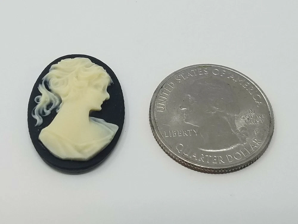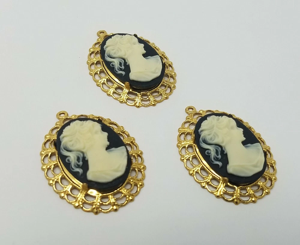 Pack of 3 pieces Ivory on Black Victorian Lady Resin Cameos with Oval Frame Lace Filigree Settings in Hamilton Gold (Brass Plated) Finish Vintage accessories for making craft jewelry Cameos have a flat back. They measure 18 mm wide x 25 mm long. Settings measure 35 mm long (excluding loop) x 28 mm wide. VOLUME DISCOUNTS AVAILABLE ON BEADS AND JEWELRY CRAFT SUPPLIES! Buy 2, Get 10% OFF. Buy 3, Get 15% OFF. Buy 4 or more, Get 25% OFF. MIX & MATCH ITEMS! **Must be purchased on US eBay website to be eligible.