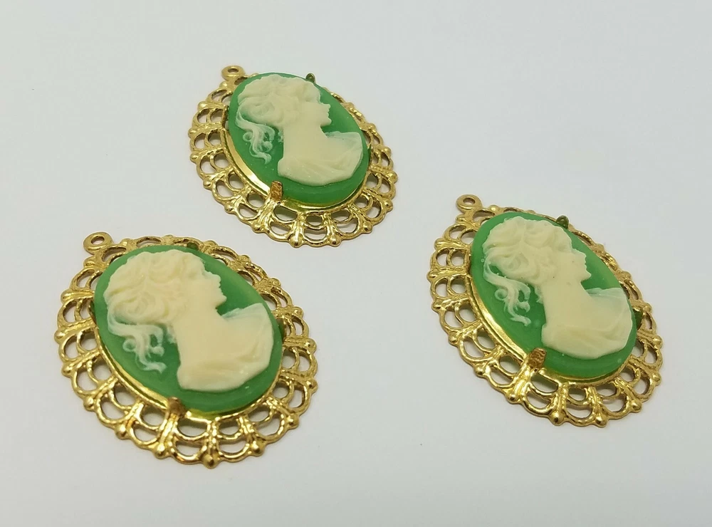 Pack of 3 pieces Ivory on Green Victorian Lady Resin Cameos with Oval Frame Lace Filigree Settings in Hamilton Gold (Brass Plated) Finish Vintage accessories for making craft jewelry Cameos have a flat back. They measure 18 mm wide x 25 mm long. Settings measure 35 mm long (excluding loop) x 28 mm wide. VOLUME DISCOUNTS AVAILABLE ON BEADS AND JEWELRY CRAFT SUPPLIES! Buy 2, Get 10% OFF. Buy 3, Get 15% OFF. Buy 4 or more, Get 25% OFF. MIX & MATCH ITEMS! **Must be purchased on US eBay website to be eligible.