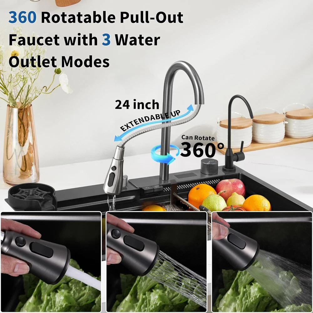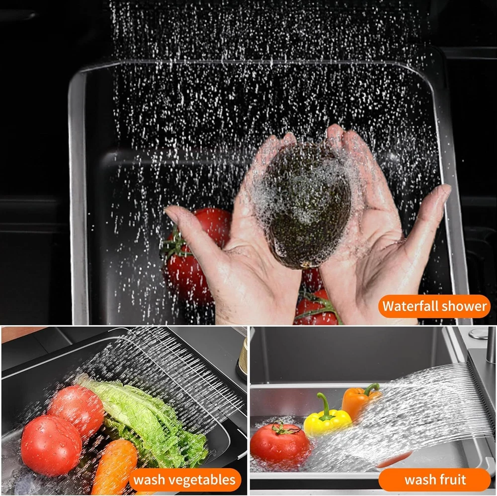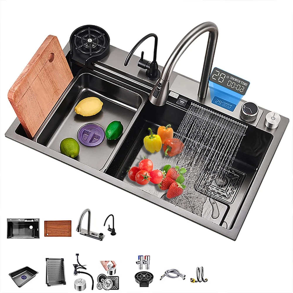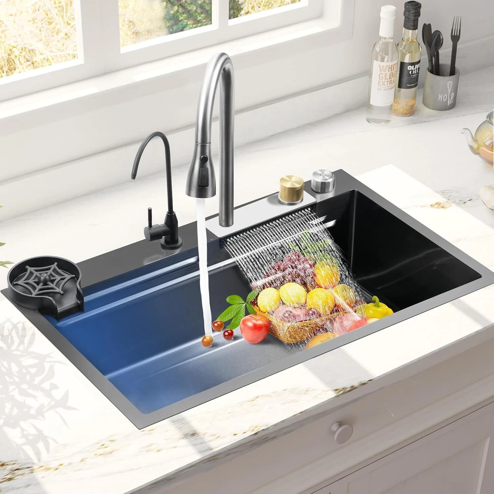 From the brand TTG Steel Kitchen Sink Our idea was to create a multi-functional sink that would help full-time moms cook and clean efficiently with less effort. TTG Kitchen Sink Stainless Steel Kitchen Sink Drop-In Kitchen Sink Waterfall Kitchen Sink Undermount kitchen sink Product Description TTG Smart Kitchen Waterfall Sink with Multifunctional Faucet 1 304 Stainless Steel 2 Noise Reduction 3 Various Size to use 4 Effecient Draining