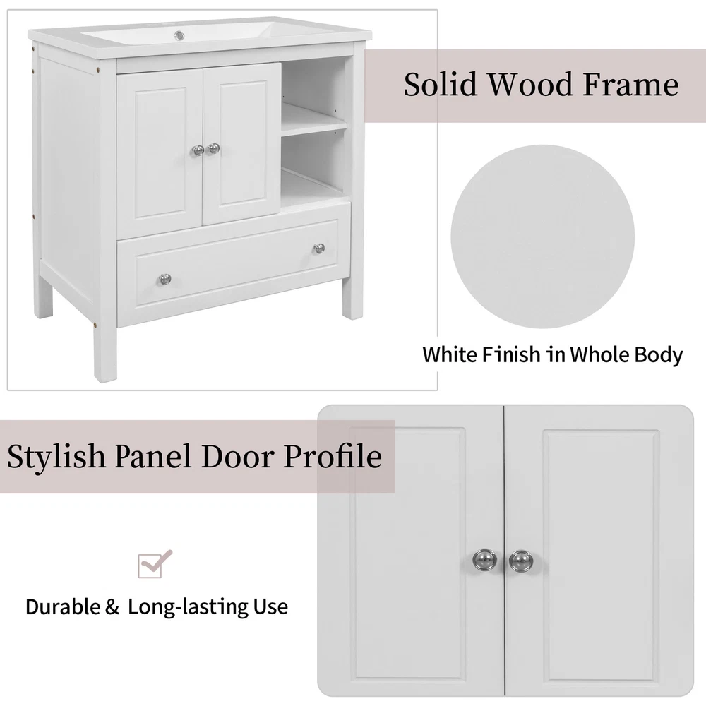 Features : 1.Demonstrate beauty and grace with the 30" white bathroom vanity base to your room. 2.The vanity's frame is crafted out of solid pine wood and features painted finish, with raised pattern design, feet, and zinc alloy hardware for an added element of beauty and grace. 3.Fully finished inside and out ensures that the vanity is water and moisture resistant. 4.The storage cabinet with two door and drawers allows big space to store your essentials. Specifications: Color :White Material :Solid Pine Wood & Board Shape :Rectangular Style :Modern Finish :White Painted Finish Mounting Type :Freestanding Features :Water & Moisture Resistant Number of Sinks Accommodated :1 Sink Type Compatibility :Undermount; Drop-In Sink Location :Center Doors Included :Yes Drawers Included :Yes Hardware Included :Yes Leg Design Feet Assembly :Assembly Required Product Size :30.00"L x 18.03"W x 32.13"H Package Size :33.36"L x 20.49"W x 9.33"H Gross Weight :54.23lbs Net Weight :48.51lbs Package Includes: 1x 30" Bathroom Vanity Base Only Demonstrate beauty and grace with the 30" white bathroom vanity base to your room. The vanity's frame is crafted out of solid pine wood and features painted finish, with raised pattern design, feet, and zinc alloy hardware for an added element of beauty and grace. Fully finished inside and out ensures that the vanity is water and moisture resistant. The storage cabinet with two door and drawers allows big space to store your essentials.