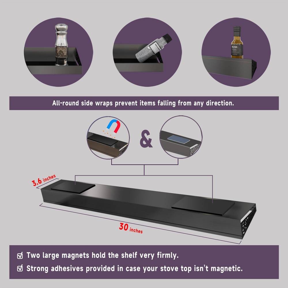 ๐น EXQUISITE DESIGN: stove top shelf, naturally blended in with your stove, gives your kitchen a new look. With unique patterned side wrap, which is inspired by orchid, stove top shelf can easily prevent items from falling from any direction. ๐น EXTRA KITCHEN STORAGE: stove top shelf is designed to organize your frequently used items for cooking. Place spices, oil, condiments within your reach while cooking and never spend time searching for them; Or decorate it in your own way into a beautiful place. ๐น EASY CLEAN AND MAINTENANCE: stove top shelf is made of high-grade stainless steel with excellent rust and corrosion resistance. The side wrap adopts half-enclosed design, which makes it very easy for cleaning. Just wiping the spill off with kitchen towel or rinsing with tap water. ๐น ZERO INSTALLATION: Installation is a breeze, just stick the adhesive pads on the stove top and place the shelf on it. Whether your stove top is made of plastic, aluminum, or stainless steel, they can securely attach the stove very firmly. ๐น NOTE: Measuring 30" x 3.6" x 1.14", stove top shelf is designed to flat stove tops.