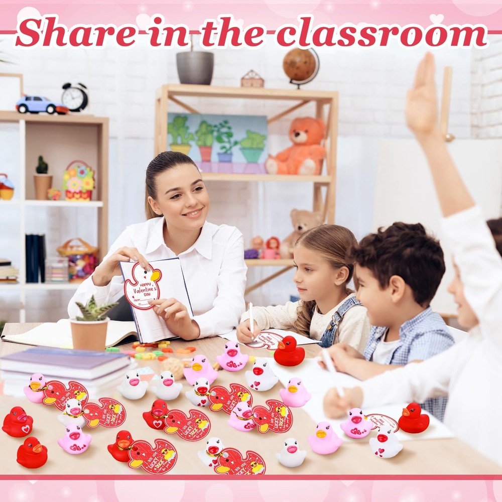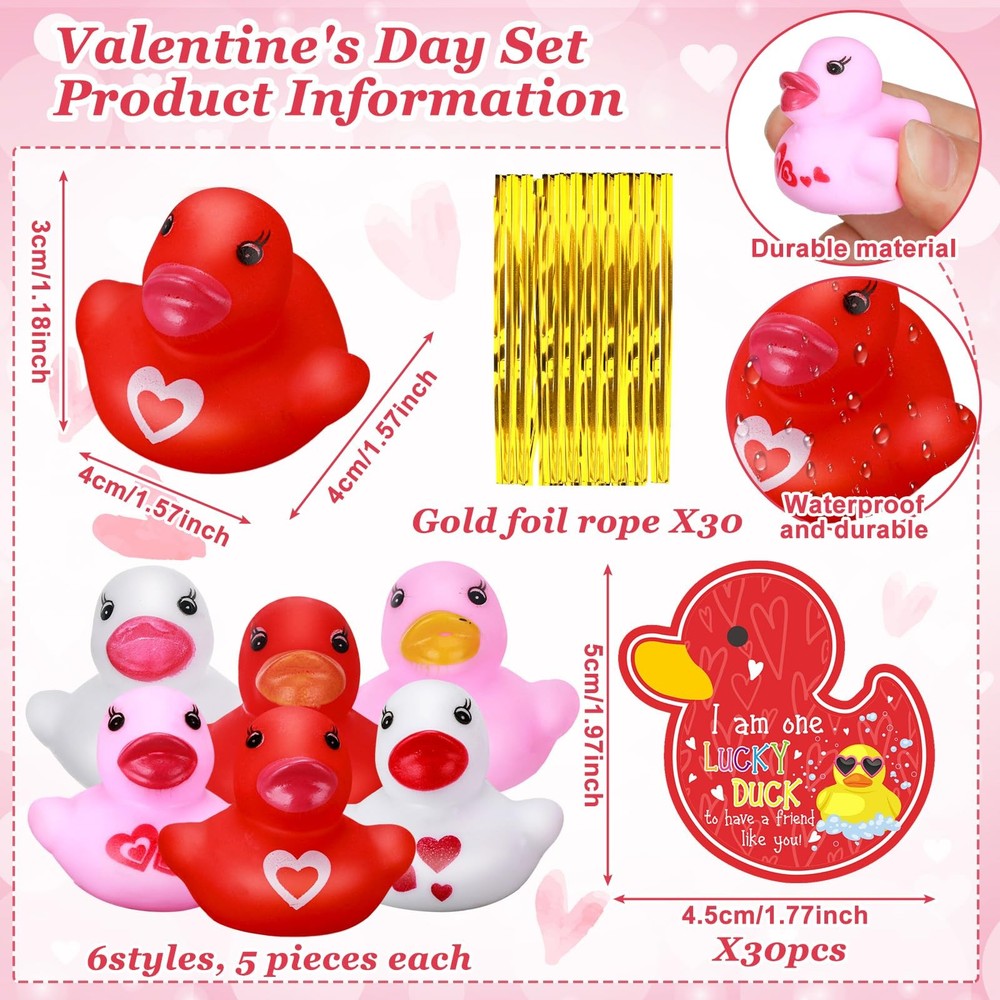 These mini rubber ducks are absolutely adorable and perfect for Valentine's Day! The set comes with cute gift cards and gold foil string, making them ideal for classroom exchanges or party favors. The ducks are well-made, and the variety adds a fun touch. Great value for the price—everyone loved them!