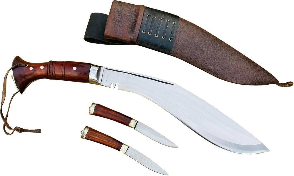 Spec of 12" long blade famous Survival Military Kukri Knife: This is handcrafted kukri therefore please note that each one might have slight variations in measurement. Blade size: 12 inches, semi-polished blade Handle size: 5.5 inches full tang dark white sadan wood handle Overall Length: 17.5 inches from tip of the blade to pommel (Approx). Weight: about 1.75 lbs (28 oz) with blade, sheath & utility knives. Scabbard: Cotton Covered in Buffalo leather Origin: Hand forge at EGKH factory in kathamandu Nepal. Blade Hardness: spine: 22-25 RC, Belly: 45-46 RC, Edge: 58-60 RC, Steel General Information about Kukri