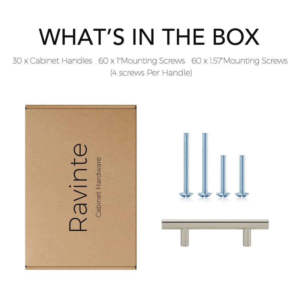 eBay Product Listing Welcome to Your Favorite My Store Your satisfaction is our top priority – Shop confidently 30 Pack | 5'' Cabinet Pulls Satin Nickel Stainless Steel Kitchen Drawer Pulls Cupboard Pulls Brushed Nickel Cabinet Handles 5”Length with 3” Hole Center Item Gallery Item Description MODERN: Functional & elegant, These brushed nickel pulls suitable for different styles of cabinets, wardrobe, chest and cupboard. [MEASUREMENT]: Hole centers(CC):3 inch(76mm), Total Length:5 inch(127mm), Diameter:1/2 inch(12mm) Projection:1-1/4 inch(32mm) DURABLE & STRONG: 30 bar pulls made of stainless steel finished with classic Satin Nickel coordinates well with other appliances and accessoriess. WIDELY COMPATIBLE - Cabinet handles set, blend traditional and modern style, suitable for different styles of kitchen cabinets door and drawer . Includes short screws in 1” and long screws in 1.57” for your convenience. Special Features For over a decade, has always been committed to bringing the best home revitalization experience to our users for we deeply understand what does a beautiful and fashionable house mean to a whole family. The Euro-style cabinet handle finished with matte black provides an elegant modern flavor to your cabinet and even your whole room. Fashionable and durable design coordinates with many décor themes, and are proven to be functional and elegant through years of use. Stainless steel handles can be used anywhere in the house to revitalize your kitchen or bathroom and provide any furniture updates. 30 handles in a coordinating design and finish with two mounting holes can also be applied in cabinet drawers. Decorative Cabinet Hardware Revitalization with cabinet pulls is perfect for accenting the décor and style of existing cabinets or furniture. Decoration with our cabinet handles provide you with great convenience to change look and feel of an entire room. Stainless Steel Cabinet Pulls Adds a Distinguished Look The cabinet bar pulls elaborately crafted and designed to beautify your house with their simplicity. Tough Durable Design The lightweight but durable cabinet pull is built to withstand over years of wear and tear. They have a nice weight to them and come individually wrapped to protect against any scratches. Sleek Appearance Quick and easy install Screws included Our Guarantee To You We offer fast shipping, free delivery, and 100% customer satisfaction guarantee. Not satisfied? Return your item for free within 30 days. 30-Day Free Returns Shipping Details Items will be sent to your eBay address. Please verify before purchasing. Typical delivery within 3-7 business days. Professional shipping services used for all orders. We ship to the continental US (48 states only). Unable to deliver to Alaska, Hawaii, or territories. No APO/FPO or PO Box deliveries available. We use eco-friendly packaging Payment Options We accept these secure payment methods: All transactions securely processed through eBay's payment system. Simple Returns 30-Day Satisfaction Promise Contact us through eBay messages within 30 days of delivery. We'll provide return instructions and our address. Return the item in its original condition. We'll process your refund within 48 hours of receiving the item. Get In Touch Have questions about your order? Contact us through eBay messaging for prompt assistance. We typically respond within 24 hours.