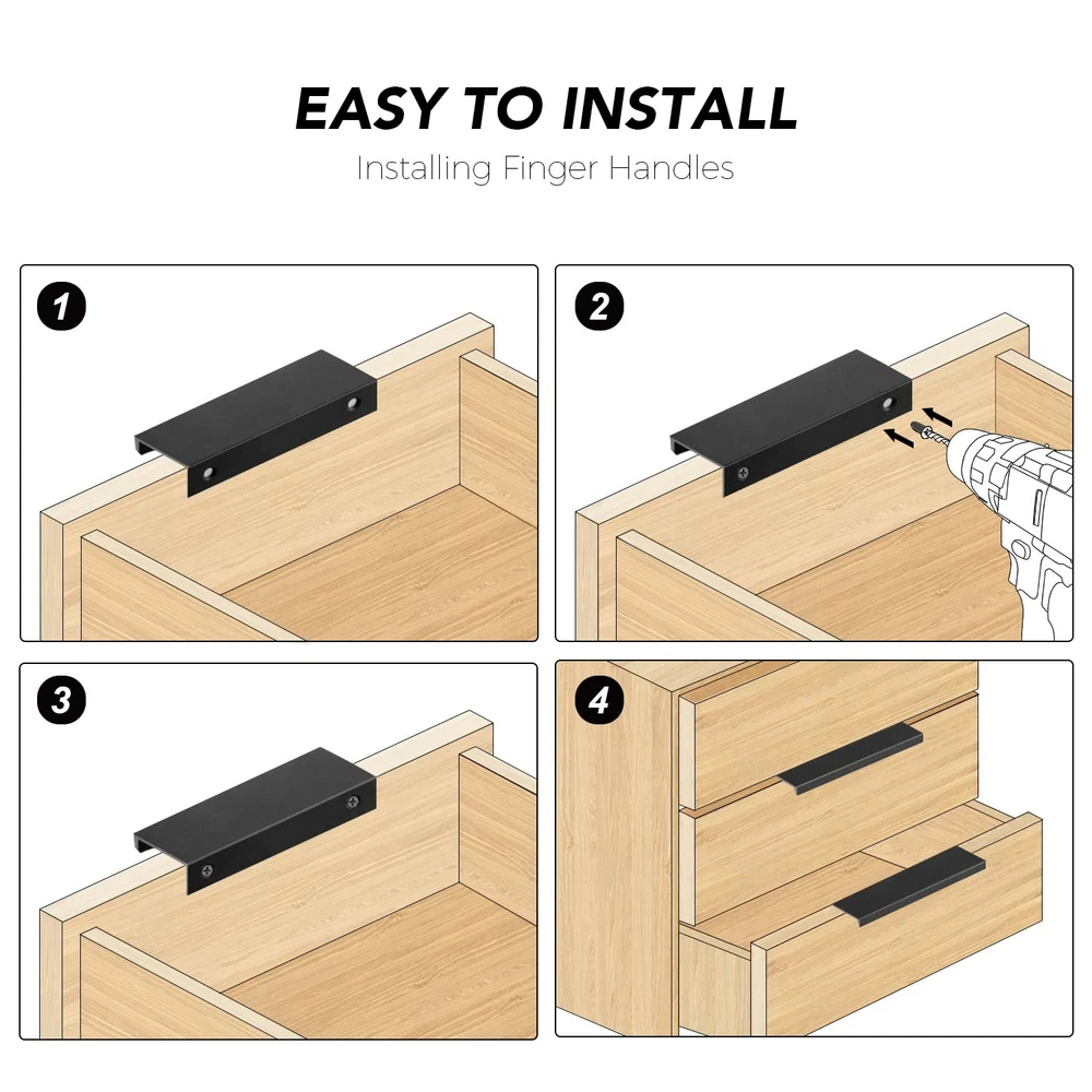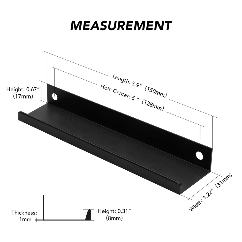aims at taking the best home revitalization experience to our customers. Product Features: Material: finger edge pulls are made of high quality aluminium material, light weight with strong quality. They are waterproof and anti-rust with a long service life. Easy to Install: Simply use the screwdriver provided to attach the handle and the installment will be finished in seconds. Widely Used: These black closet finger pulls give your cabinets a modern style with elegant touch. They worked perfectly in your kitchen or bathroom renovation to deliver modern yet classic and simple look. Product Parameter: MEASUREMENT : Screw Hole Center: 128mm(5inch) Overall Length: 150mm(5.9inch) Width: 31mm(1.22 inch) Height: 17mm(0.67inch) Accessories: Self-tapping screws (2 for each handle) Screwdriver*1 Measurements: Screw Hole Center: 128mm(5inch); Overall Length: 150mm(5.9inch); Height: 17mm(0.67inch); Width: 31mm(1.22 inch) Comprehensive Customer Support: If you have any questions before or after your purchase with our black concealed pulls, feel at ease to reach out to us. We will address your concerns within 24 hours Material: finger edge pulls are made of superior aluminium material, light weight with strong quality. They are water-resistant and anti-rust with a long service life Easy to Install: Simply use the screwdriver and the self-tapping screws provided to attach the handle and the installment will be finished in seconds Widely Used: These black closet finger pulls give your cabinets a modern style with elegant touch. They worked in your kitchen or bathroom renovation to deliver modern yet classic and simple look