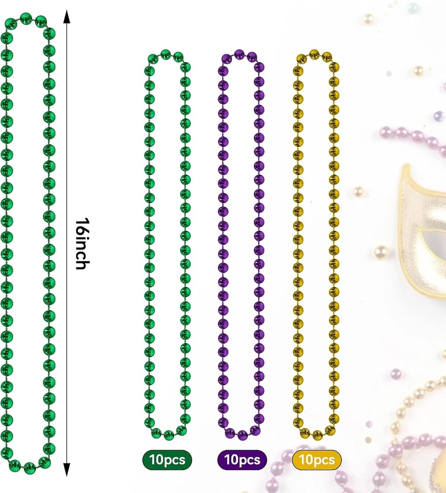Free eBay listing template designed by dewiso.com 30 Pack Mardi Gras Beads Necklaces Bulk, Mardi Gras Accessories for Party Favors, Gold Green and Purple Decoration St Patricks Day Necklace Party Supplies Mardi Gras Decor For Party, School Event,Home FREE AND FAST SHIPPING! 30Pcs Mardi Gras Accessories: Each mardi gras decorations set contains 30 mardi gras beads necklaces. There are three colors, purple, gold and green, the number of each color is 10. Mardi Gras beads necklace can meet your decoration needs Perfect Mardi Gras Decorations: The mardi gras necklace beads is great as mardi gras party supplies, st patricks day necklace, mardi gras party decorations, kids birthday party, school events or other places. Mardi gras necklaces beads make your carnival more festival. With purple gold green color, it can become the highlight of the party or celebration High-Quality Materials: The mardi gras beads are made of high-quality materials. Each mardi gras beads bulk decorations are carefully crafted, and the gloss and texture are also great. You can enjoy the happiness and joy of these mardi gras beads bulk Widely Applicable for Many Occasions: The mardi gras beads necklaces are not only suitable for decoration, carnival decoration, st patricks decoration and birthday party. Also ideal choice as home decorations, school events supplies, classrooms, social gatherings, etc., to create a holiday atmosphere. You can reuse these mardi gras beads for different party Enjoy Our Service: When you buy Mardi Gras Beads Necklace in our store, if you have any further questions,please don't hesitate conta ct us by "Ask a question",we will follow up with you as soon as possible Tips: Not for children under 3 yrs. Recommended for kids above 3 years old; Please using under adult's supervision when the children under 3 years old Product We offer a 30-Day Return Policy on items which you are not completely satisfied with. You have the option for a full-refund or an exchange of the item. No returns are available on items shipped outside of the US . Shipping We offer Free Shipping to the US and ship within 2 business days of payment, usually sooner. We use UPS express shipping. That's why your products are usually delivered within 3 days . Contact We try our very best to make sure every customer is completely satisfied. If there's a problem , message us! We're happy to help. 24/7 live chat available.