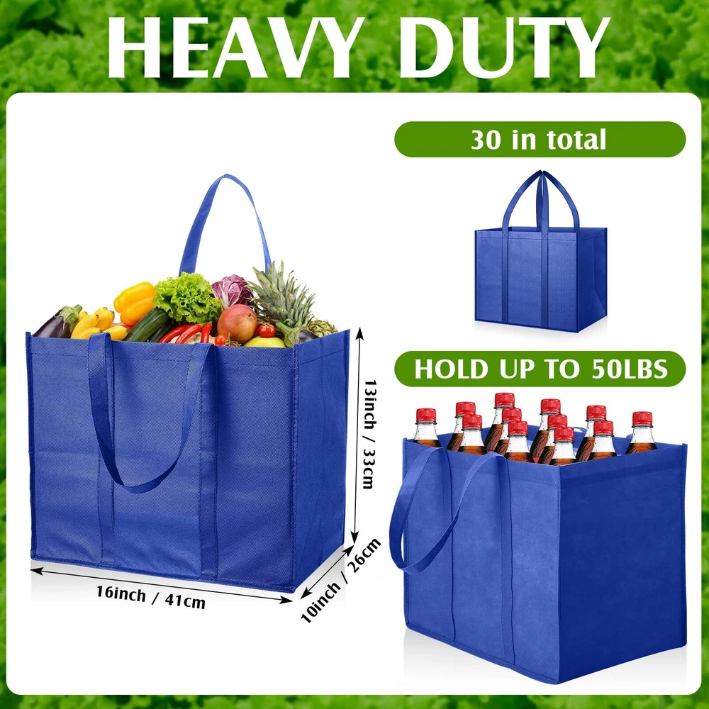 Extra Large Capacity: you will receive 30 pieces of foldable tote bags, sufficient quantity to meet your various needs and replacements; Each packable tote bag measures approx. 16.1 x 13 x 10.2 inches/ 41 x 33 x 26 cm (L x H x W), can be stored in kitchens, cars, handbags, backpacks and suitcases, ideal for daily use and travel Heavy Duty: these shopping bags for groceries heavy duty are made of non woven fabric, equipped with wide and long reinforced handles that are reinforced and cross stitched to ensure durability, allowing you to carry them easily by hands or over the shoulder; The large tote bag bulk is heavy duty, can hold up to 45 lbs things, won't easily break, serving you for a long time Washable and Reusable: the heavy duty tote bag can be folded into a small volume for easy storage, convenient for going shopping and saving space; The large tote bag is washable and reusable, easy to clean and maintain, just wipe off the dirt with a damp cloth or rinse under cold water, then let it air dry With Sturdy Bottom: these reusable tote bags with handles also come with sturdy bottoms, which can stand sturdily and upright, providing stability for your items, and keep them from tipping over when carrying the reusable grocery bags washable or when being placed in your car, trunk, shopping cart, counter, or floor, also easy for your loading and unloading Wide Ranges of Usages: the cloth tote bag is versatile to use in daily life, ideal for carrying and storing vegetables and fruits, toys, food, clothes and so on; The extra large shopping bag is also suitable for various occasions, including camping, picnic, barbecue, painting, traveling, shopping, transporting, supermarket, farmers market, school, office, library, gym, beach and daily use