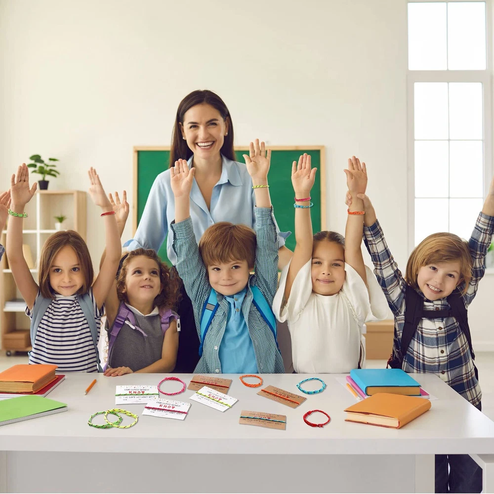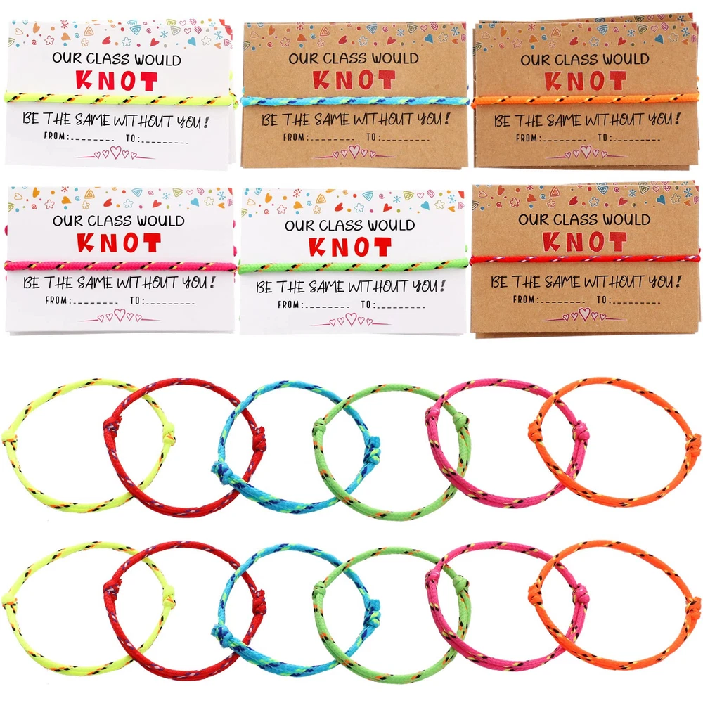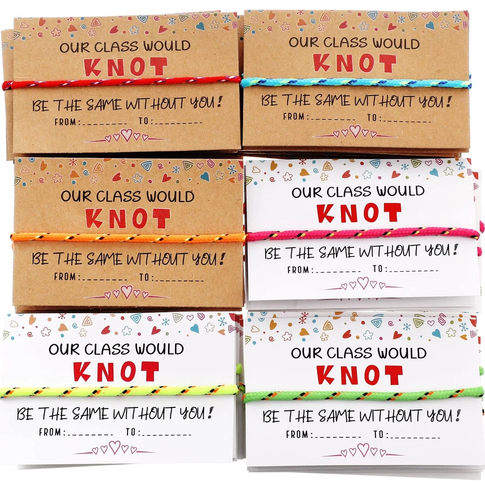 Features: You can use these kid bracelets as rewards to your baby when they achieve great progress. They will feel happy and satisfied when receiving such colorful decorations. When some important days are coming, write something you want on this valentine card for friend to show your sincere and warm thoughtfulness. It is warm hearted of you to bring warmth to your surroundings. Specifications: Material: Friendship bracelets: polyester Valentine's Day cards: cardboard Main color: Friendship bracelets: white, brown Valentine's Day cards: pink, orange, yellow, green, cyan and red Size: as the pictures shown Package includes: 30 x Friendship bracelets 30 x Valentine's Day cards Notes: Manual measurement, please allow slight errors on size. The color may exist a slight difference due to different screen displays. Valentine's Day Card Bracelets: these 30 pieces of friendship bracelets are reliable and soft, made of polyester, enough quantity for you to wear for birthday party, campus activity, school teacher reward, colorful and vibrant, and let your party shine more Various Choices: there are 2 styles of funny anniversary cards of different colors including white and brown; The colors of these bracelets are pink, orange, yellow, green, cyan and red, nice as a gift for someone else; The text on the cards is [OUR CLASS WOULD KNOT BE THE SAME WITHOUT YOU Adjustable for Most People: this kind of Valentine knot neon bracelets can easily be adjusted via knot to fit most sizes, suitable for small, medium and large wrists; These friendship bracelets are charming and beautiful wearing on you Meaningful Gift: the classroom valentines cards and knot bracelet are suitable for girls, boys, students, friends, girlfriend, and boyfriend; And it will be a meaningful gift for Valentine's Day, Mother's Day, Christmas, Thanksgiving, birthday, graduation, anniversary, engagement or wedding Nice Blessing Cards: you can write many appreciation or blessing words on these adult Valentine's Day cards, to show your care and concern; These delicate cards are made of sturdy cardboard, which can be stored for a long time