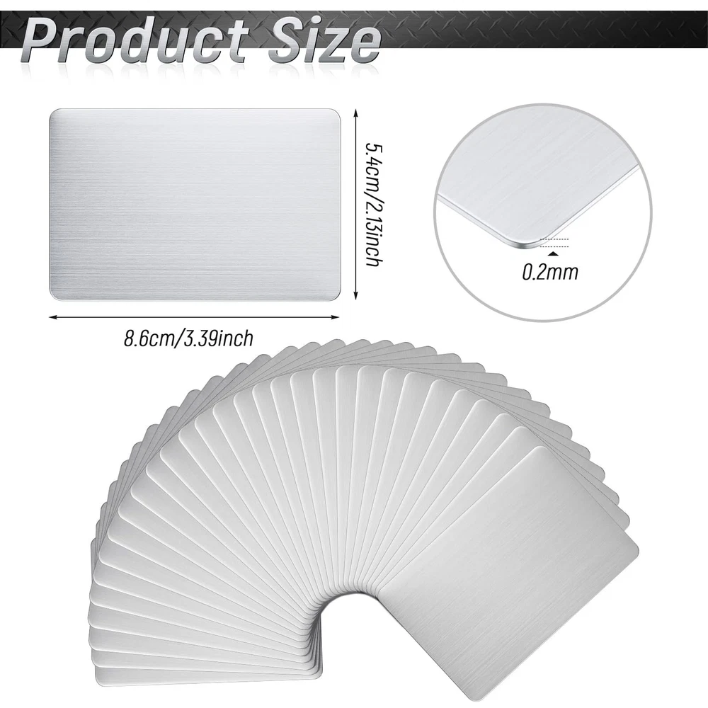 30 Pieces 304 Stainless Steel Metal Business Cards Blank 0.2mm Thickness Product Details Enough to Share with Others: the package will bring you 30 pieces of steel cards in total, classic and cool, very useful in your daily life; An abundant quantity can easily meet your daily application and replacement requirements, you can also share them with others Reliable Workmanship for Lasting Service: made of 304 stainless steel, these blanks metal business cards are solid and hard, not easy to bend, deform, or break under pressure, smooth and flat for you to touch, and can accompany you for a long time Proper Dimension for You to Apply: each steel business card measures approx. 0.2 mm in thickness, thick and firm, easy for you to carve; And it is approx. 86 x 54 mm/ 3.39 x 2.13 inches in size, compact and portable, light in weight, convenient for you to carry around and store in pockets, bags, and more Unfinished Design to Explore DIY Pleasure: the metal card is blank on both sides, you can carve prints, texts, words, and others you want, which are hard to wear; You can also create your own personalized cards, showing your style and taste in this way Versatile Usage: these blank business cards can be made into different items according to different needs, such as gift cards, VIP cards, table cards, labels, business cards, nameplates, and many others, provide you with a lot of convenience Features:Show your love and care:You can send these blank metal business cards to your classmates, colleagues, clients, neighbors, guests, friends, family members, loved ones, and others, expressing your love and care for them.Assorted places to use:These small business cards can be applied in many places, such as offices, conference rooms, hotels, restaurants, coffee shops, homes, and so on, helping you mark names and others.Specifications:Material: 304 stainless steelColor: as picture shownSize: approx. 86 x 54 mm/ 3.39 x 2.13 inchesThickness: approx. 0.2 mmPackage includes:30 x Blank metal business cardsNotes:Manual measurement, please allow slight errors on size.The color may exist slight difference due to different screen displays.