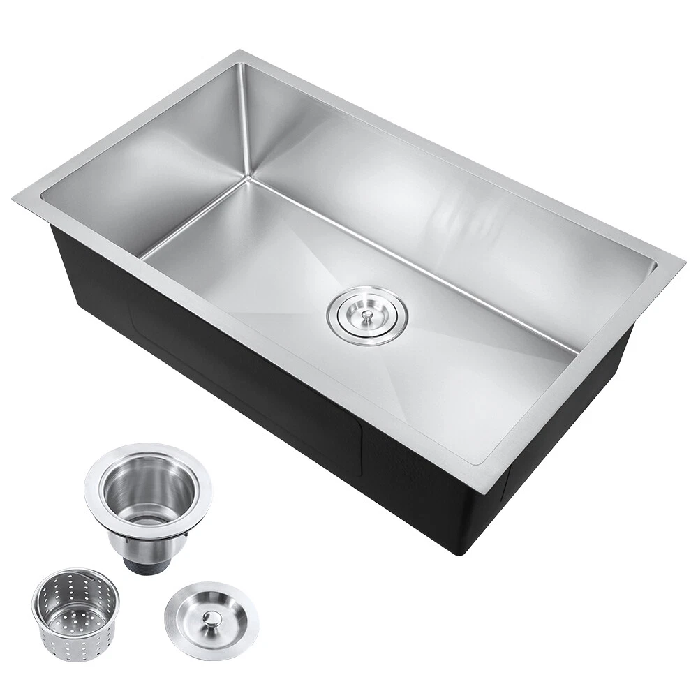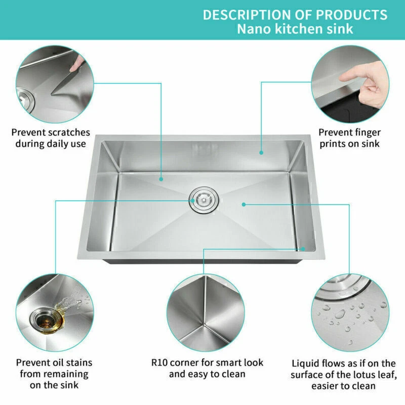 DO NOT SHIP TO PR!!! Product Dimensions 30in Single Bowl Sink: 30" L X 18" W (front-to-back) X 9" Note: That the item does not contain a faucet The Nano Commercial grade brushed finish for easy to clean and long-lasting ,stainless steel with satin finish ensures that it is highly resistant to dirt and grime, easily wipes clean, and matches most kitchen appliances. Heavy duty sound guard undercoating and thick rubber padding to minimize noise and reduce condensation Stainless steel basket strainer drain that traps goods waste and can be easily emptied into the trash. Features: 20 Gauge stainless steel thickness 10mm radius corner for easy cleaning and modern look Nano Commercial grade brushed finish for easy to clean and long-lasting Heavy duty sound guard undercoating and thick rubber padding to minimize noise and reduce condensation Slanted bottom with elegant drain grooves for easy water draining USA standard 3.5'' drain opening will fit any garbage disposal unit Drain placement – Rear drain placement ensures dishes don't settle on the drain Stainless steel basket strainer drain that traps goods waste and can be easily emptied into the trash Accessories Strainer Cut-out template paper Installation mounting brackets hardware Package Package: Foam corner guard+7 layers stronger carton