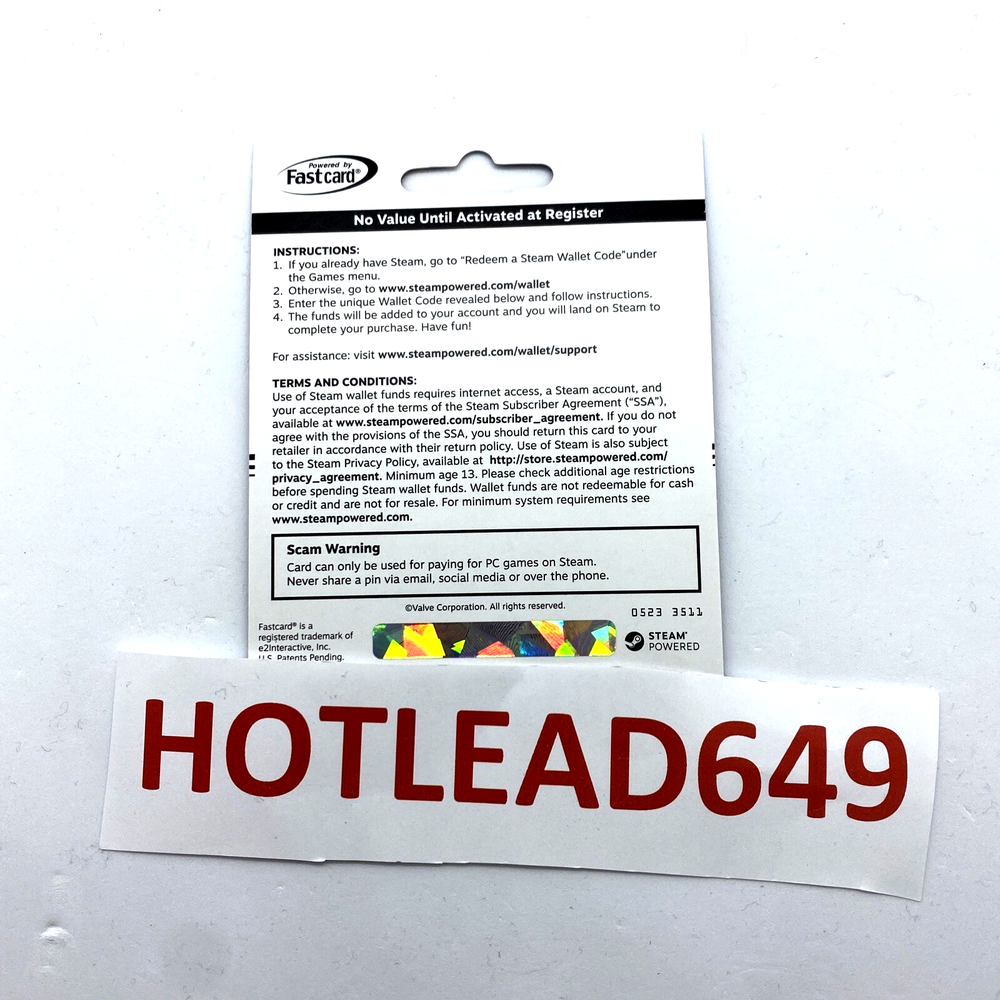 Are you sharp-shooting asassin? Do you seek glory on the gridiron? Can you devise the most cunning of strategies in open combat? When you're a gamer, there's no such thing as click for ios and android purchases https://www.ebay.com/itm/286655001284 "Game Over." Ensure you never run out of gaming Steam by fueling the action with this Steam Wallet Card.Your key to a world full of gaming possibilities, Hotlead649 this Steam Wallet Card provides you with $50 to spend on the content you crave. Whether you're a soldier, athlete or explorer, one thing's for sure — you're a gamer. Are you ready for some Steam-powered action? These gift cards are BRAND NEW and have NEVER been USED, SCRATCHED, or ACTIVATED.All gift cards will be shipped via USPS mail, will not sent digitally. STEAM Gift card PC Prepaid Giftcard Game Card Game Gift Card. Hotlead649 Steam 30$ dollar Wallet Card. Instant Access to Thousands of Games. Enjoy exclusive deals, cloud saves, automatic game updates and other great perks. Create and Share Content. Gift your friends, trade items, and even create new content for games in the Steam Workshop. Hotlead649 Help shape the future of your favorite games. Join the Community. Meet new people, join game groups, form clans, chat in-game and more! With over 100 million potential friends (or enemies), the fun never stops. Entertainment Anywhere. Whether you're on a PC, Mac, Linux box, mobile device, or even your television, you can enjoy the benefits of Steam. Add money to your Steam Wallet and enjoy all of your favorite PC, Mac, and SteamOS games Instant Access to Thousands of Games Create and Share Content Cards are brand NEW Will Not accept returns on Gift Cards