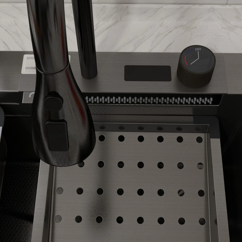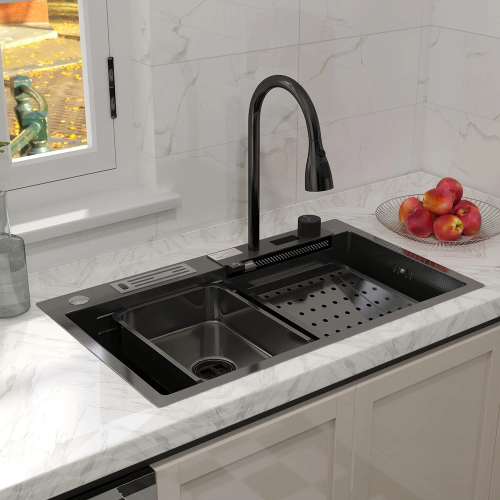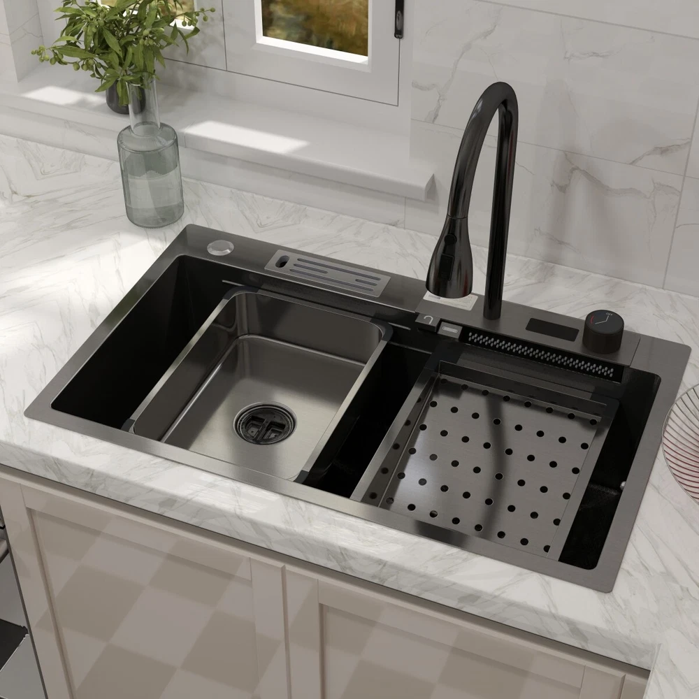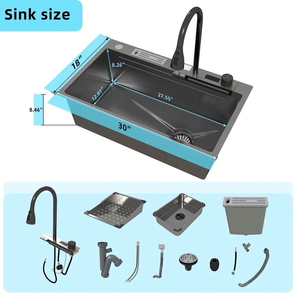 Description This Multifunctional Stainless Steel Sink for Dishwashing is an essential and highly durable kitchen appliance that ofers a blend of functionality, hygiene, and aesthetic appeal. Crafted from premium-grade 304 stainless steel, this sink stands out for its superior qualities that make it a preferred choice for modern households and commercial settings alike. Features **Premium 304 Stainless Steel **: The kitchen sink is made of high quality stainless steel, with super strength and durability. Imitation honeycomb nano-coating is ‘anti-scratch’ and easy to clean, also can withstand high temperature **Multi functional Practical Design**: This nano kitchen sink has a one-of-a-kind design that incorporates a waterfall, which not only makes the sink more beautiful to the eye but also makes it easier for water to flow without splashing and reduces the amount of water that is wasted. The pull-down faucet with three water outlet methods meets different needs. There are double-layered sliding tracks on both sides of the inner wall for sink accessories, allowing for partitioned operations. It not only saves more space but also adds a level of convenience and flexibility to kitchen chores. **Efficient Drainage**: The gently sloping bottom of the built-in kitchen sink prevents water from accumulating in the bowl and draining quickly without clogging. **Noise Reduction Features**: The exterior of the kitchen sink is equipped with thicker, softer rubber shock pads and an anti-condensation coating that provides additional sound insulation and protects the cabinets from moisture and warping. **Package Details**: Kitchen Sink*1, Pull-out Faucet*1, Drain Basket*1, Basin*1, Tool Carrier*1, Water Leakage*1, Angle Valve+Gravity ball*1, Draining Kit*1 (Includes a complete set of accessories). Specification Material: Stainless Steel Colour: Black Shape :Rectangle Exterior Dimensions: 30" x 18" x 8.46" Internal Dimensions: 27.55" x 13.97" x 8.26" Net Weight: 22 lbs Package Content 1 x Kitchen Sink Workstation (Includes complete set of accessories) 【Customer Service】 Please feel free to contact us if you have any problem, we will help you resolve any issues in the shopping process. On Sep 28, 2024 at 04:53:46 PDT, seller added the following information: On Oct 8, 2024 at 03:48:26 PDT, seller added the following information: On Oct 15, 2024 at 23:43:42 PDT, seller added the following information:
