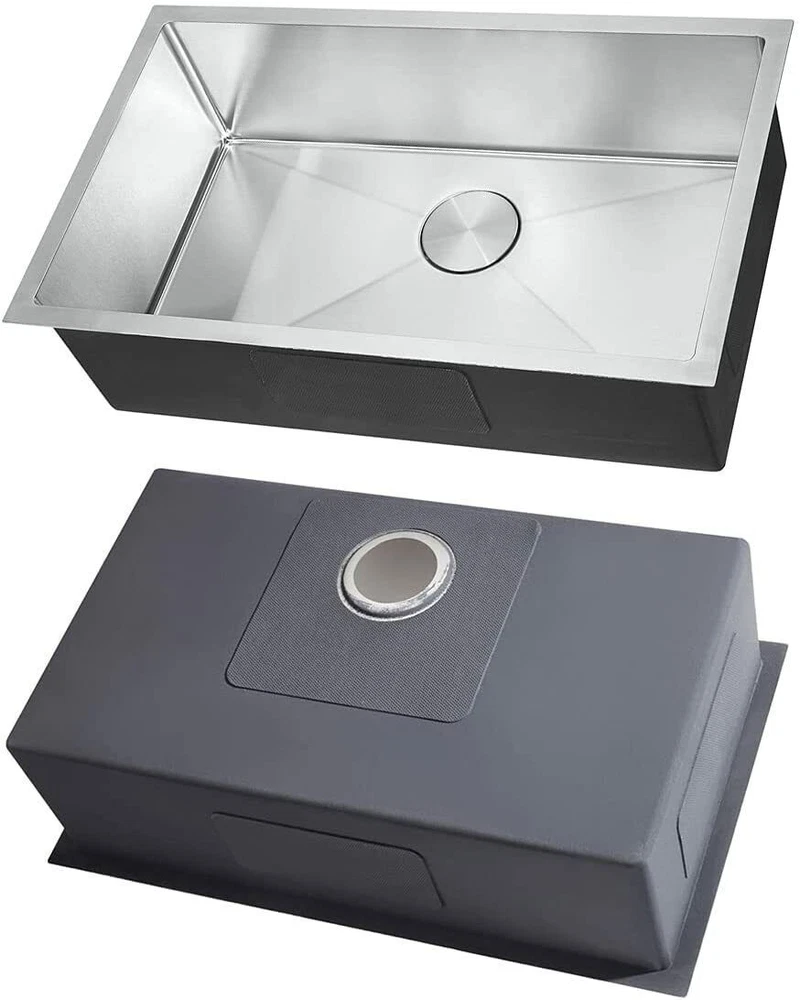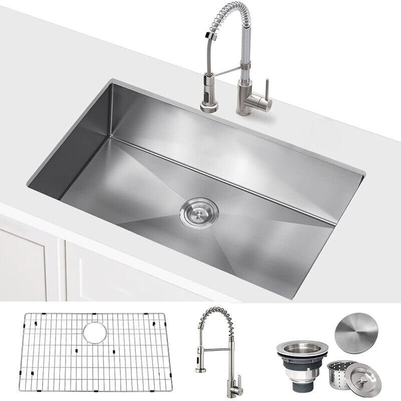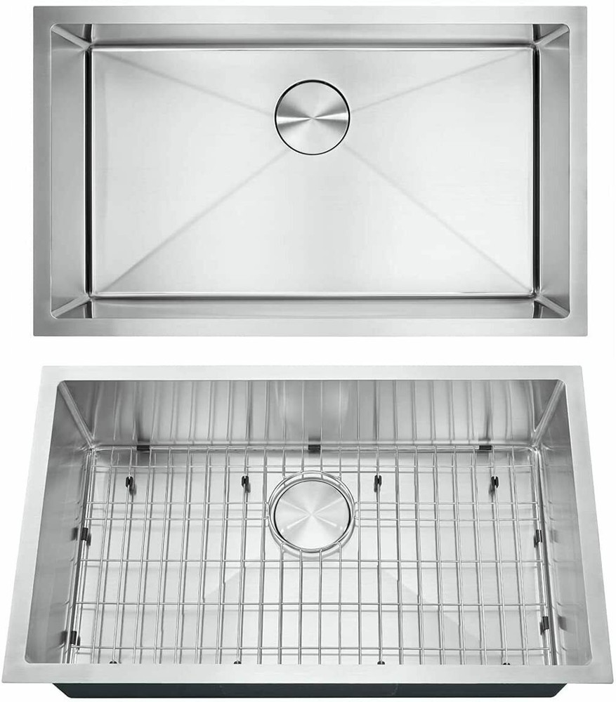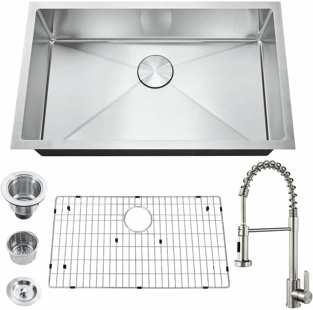 Features: Handmade Kitchen Sink Combo With Faucet package together Premium 304 grade stainless steel with excellent corrosion and rust-resistant 18 Gauge stainless steel thickness 10mm radius corner for easy cleaning and modern look Commercial grade brushed finish for easy to clean and long-lasting Heavy duty sound guard undercoating and thick rubber padding to minimize noise and reduce condensation Slanted bottom with elegant drain grooves for easy water draining USA standard 3.5'' drain opening will fit any garbage disposal unit Drain placement – Rear drain placement ensures dishes don't settle on the drain Stainless steel bottom rinse grid can protect the sink from scratches and acts as a drying rack for pots and pans Stainless steel basket strainer drain that traps goods waste and can be easily emptied into the trash Stainless steel decorative drain cover that adds to the visual beauty .It covers the drain while allowing water and waste to flow through under it . Product Weights & Dimensions 30 x 18 x 9 inch 17 pounds Accessories Stainless Steel Faucet Strainer and decorative drain cover Bottom rinse grid Cut-out template paper Installation mounting brackets hardware Package Package: Foam corner guard+7 layers stronger carton