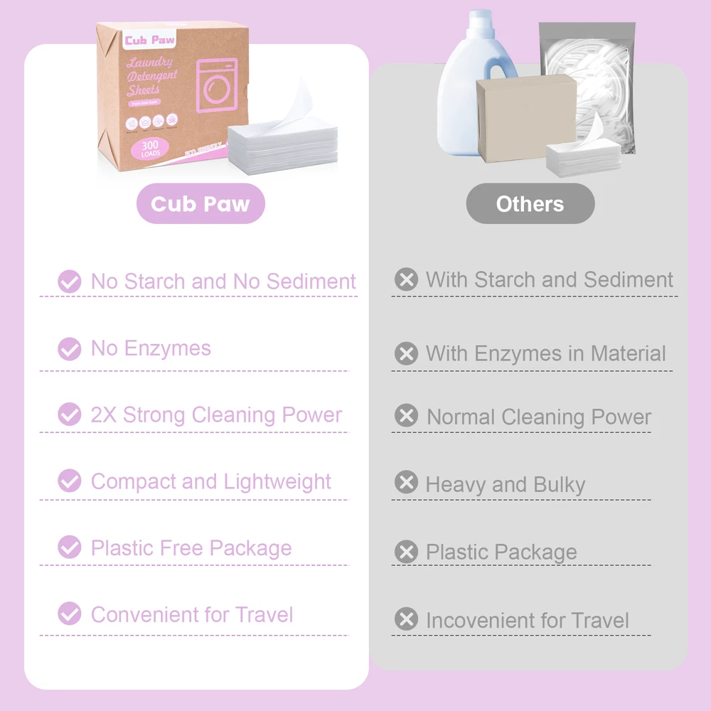 【Travel Laundry Detergent Sheets】Compact and lightweight laundry sheets, compared to large plastic jugs of laundry detergent and washing powder, are more convenient to stock up, carry out, and save space. Traveling with a few sheets in your carry-on luggage is convenient without adding weight and worrying about spills. 【Super Value in Large Quantity】 With a large capacity of 300 small loads of Laundry Sheets Detergent, unlike liquids, which are often accidentally poured in excess, you can actually feel that they are getting the money's worth. If you prefer a stronger scent, you can add a more half tablet of laundry soap! 【Eco-friendly and Deep Cleaning】The laundry detergent sheets are scientifically formulated with low-foaming, safe, and clean ingredients, which better penetrate into and between the fibers, dissolving and removing various stains like oil, coffee, and red wine from your clothes, and leaving you with fresh clothing. 【Dissolves Easily】 The disolvable washer sheets detergent adopts fast dissolve technology and upgraded surface actives to dissolve quickly and fully in both cold and hot water, which will not leave any residue on your clothes and machine after washing. 【Package Conetent】The Box contains 150 Sheets(=300 Loads), 1/2 sheet=1 load, which are precut and pre-measured to avoid overused. Measuring cups are no longer needed.