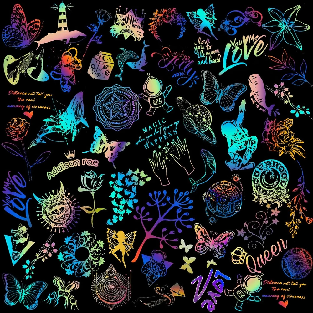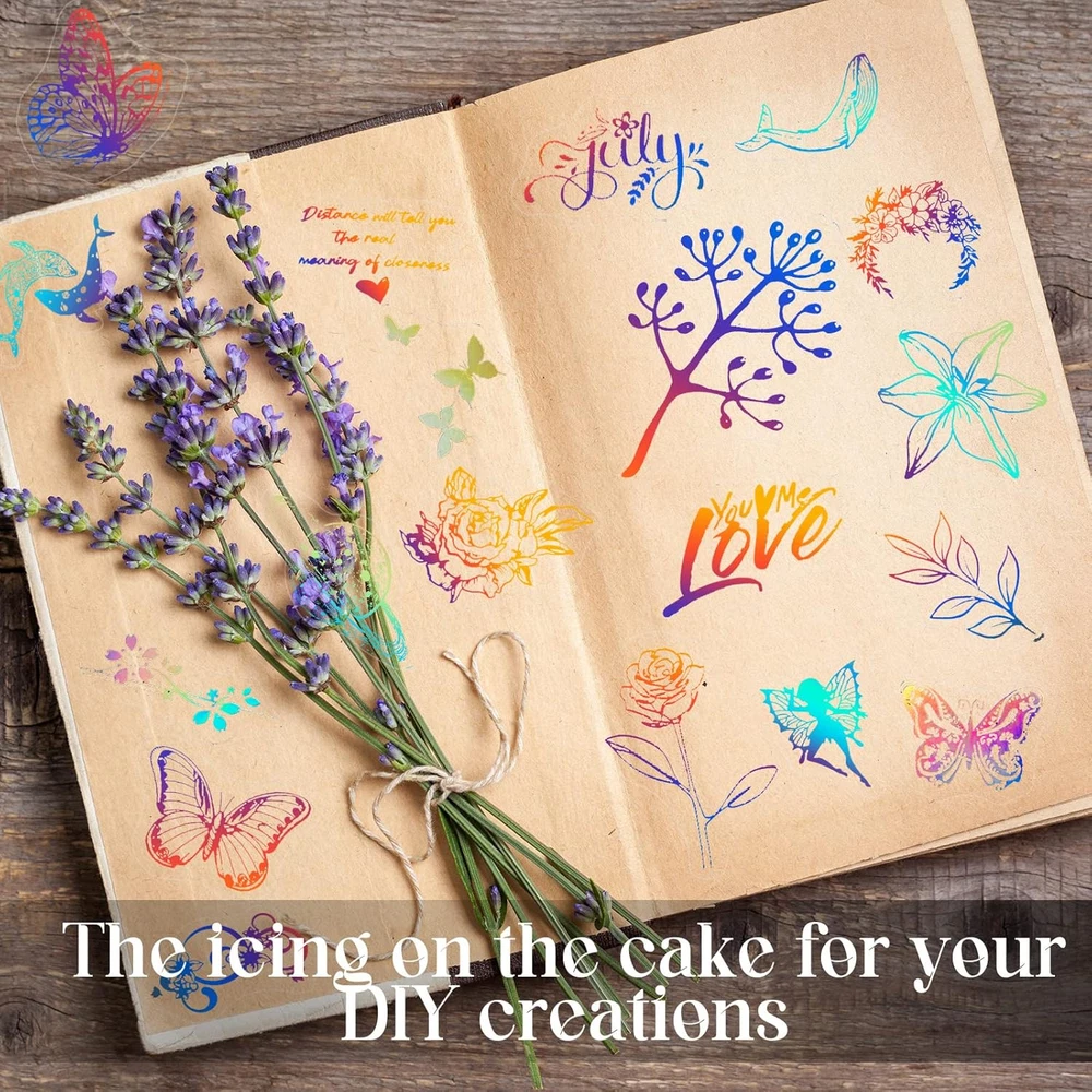 Package Includes: the package will provide you with 300 pieces of holographic stickers for resin in 6 pattern, including butterfly, flowers, whales, words, stars and galaxy, you will receive 50 pieces of each pattern, and it is designed in 2 colors, holographic and gold; They are ample in quantity and assorted in style, can well satisfy your daily use and decorative needs Quality Material: the sticker for resin art is composed of quality PET material, which has good adhesion and is waterproof, will not fall off easily and not easy to fade, break or deform; It is also reusable, can be removed without traces, so it will not damage your paper Suitable for DIY: our enough quantity of resin stickers for molds are able to support you to invite your friends or family to join your DIY projects, in which you can practice your hands-on ability, inspire your imaginary and creativity, develop the relationship between you and get the joy of the process Versatile Applications: with the transparent stickers for resin, you can make a wide range of delicate handicrafts, such as journaling decorations, resin craft work, scrapbooking, making cards, trays, home decor, gift wrapping and more DIY projects, giving a full play of your stunning imagination and creativity Gift Preparation: if you want to prepare a meaningful gift for your family member or friend, you can use the holographic stickers to make beautiful patterns on a blank canvas bag, which can not only show personalized style, also express your love and care to them, just send them on birthday, holiday, party or other occasions, to cheer them up Product Description