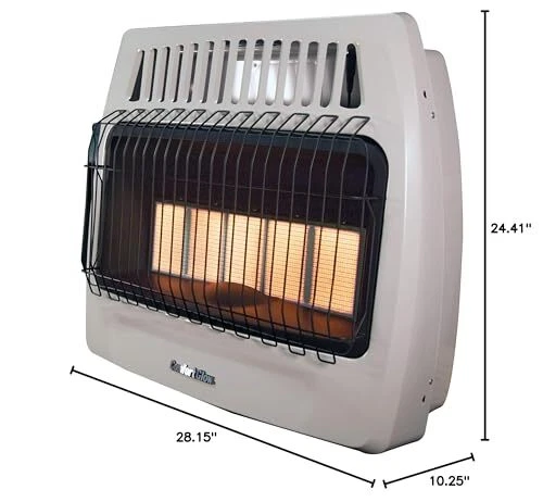 30,000 BTU Gas Heater for Indoor Use, Infrared Vent-Free The Infrared Radiant Vent-Free Heater is a powerful and efficient natural gas heater for indoor use, delivering 30,000 BTUs to heat areas up to 1,250 sq. ft. This versatile natural gas heater provides flexibility for various spaces like homes, garages, and offices. Its radiant infrared heat warms like the sun, using 5 high-quality ceramic plaques, making it a reliable space heater that operates without the need for electricity. This ventless gas heater is 99.9% fuel efficient and simple to install, requiring no external vents. Equipped with safety features such as an Oxygen Depletion Sensor (ODS) and over-pressure safety device, it offers peace of mind. The built-in thermostat allows easy heat control, and the Piezo ignition ensures hassle-free operation. With compact dimensions (24.41" x 28.15" x 10.25"), it's the perfect gas wall heater for indoor use. Heater comes ready for wall mounting. Floor Mounting Kit also available to convert wall heater to a floor unit for increased portability - Amazon ASIN B00S04XHC6. Additional blower available, Amazon ASIN B00S04X79O. Requires 120V Grounded Outlet and has Auto T-Stat Control. Fits all Kozy World and Infrared models above 10,000 BTU's and produced in 2015 or later. POWERFUL HEATING PERFORMANCE: This gas heater for indoor use delivers 30,000 BTUs of radiant heat, efficiently warming spaces up to 1,250 sq. ft., making it ideal for homes, offices, and garages. NATURAL GAS HEATER, NO ELECTRICITY REQUIRED: This gas heater operates without the need for electricity, making it a reliable source of heat during power outages or in off-grid settings. FLEXIBLE INSTALLATION OPTIONS: Heater comes ready for wall mounting. Floor Mounting Kit also available to convert wall heater to a floor unit for increased portability - Amazon ASIN B00S04XHC6. VENT FREE: This ventless gas heater provides 99.9% fuel efficiency, making it an environmentally friendly and cost-effective option for indoor spaces. No need for an external vent or chimney. RADIANT INFRARED HEATING: The heater uses 5 high-quality ceramic plaques that radiate heat like the sun, providing comforting warmth. It works as a natural gas wall heater for indoor use - space heater in any room. SAFE AND RELIABLE: Equipped with an ODS (Oxygen Depletion Sensor) and a Safe Watch Pilot system, this natural gas heater ensures safe operation. Over-pressure safety device adds another layer of protection. SIMPLE INSTALLATION AND OPPERATION: Easy to install with its compact design (24.41" x 128.15" x 10.25"), making it a great heater for office or small garage heater applications. The piezo ignition and thermostat heat control provide easy use and adjustable comfort.