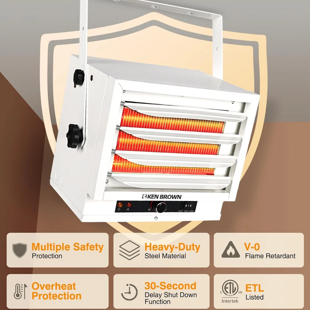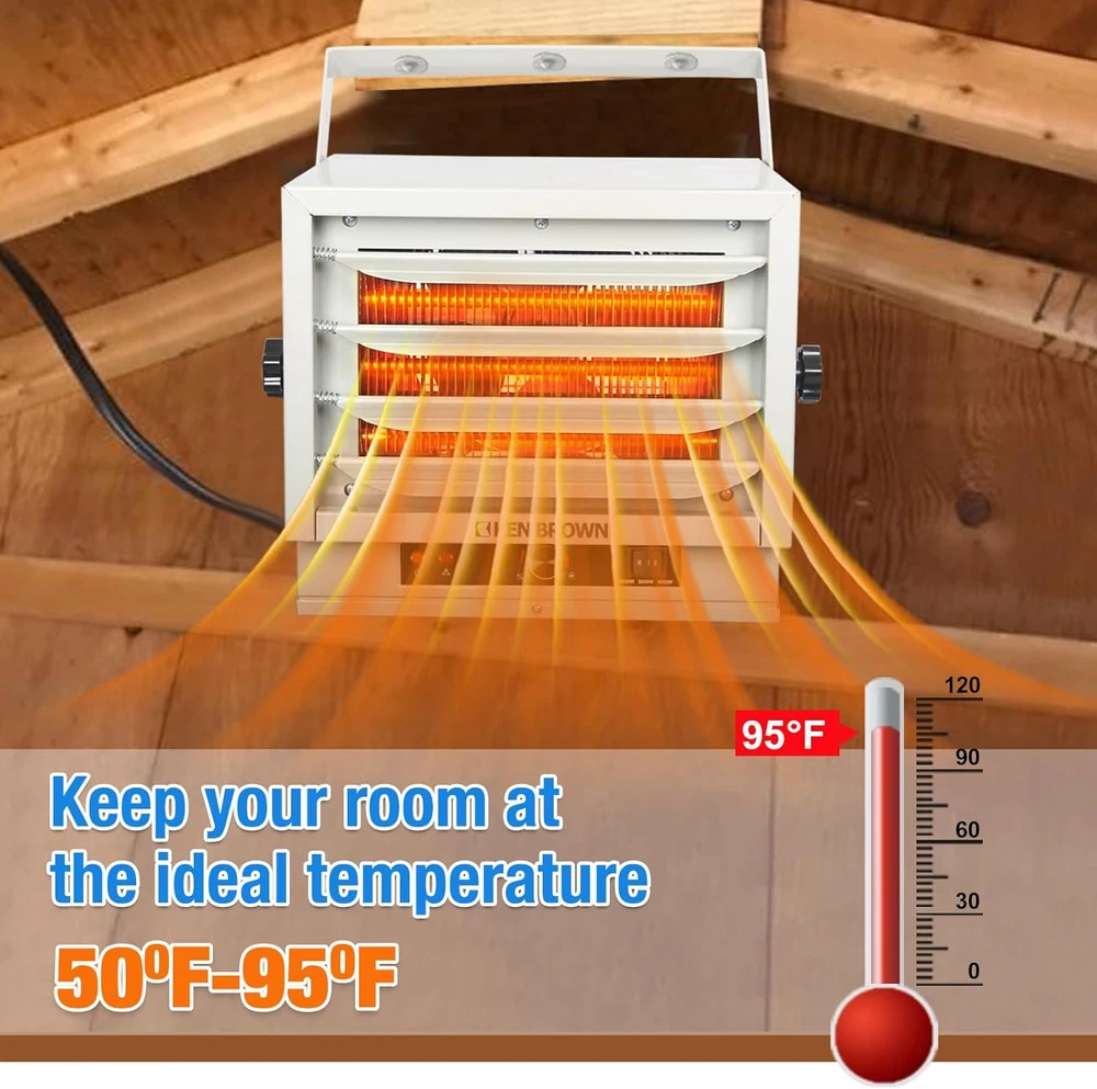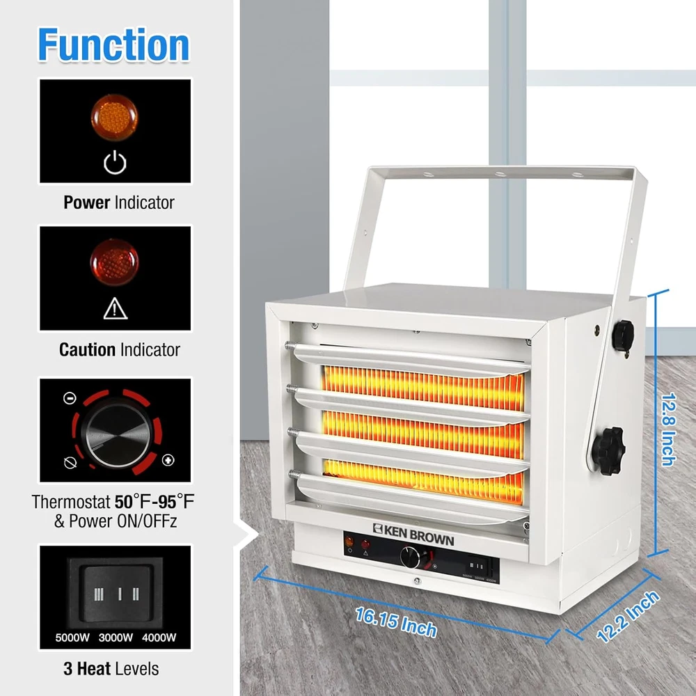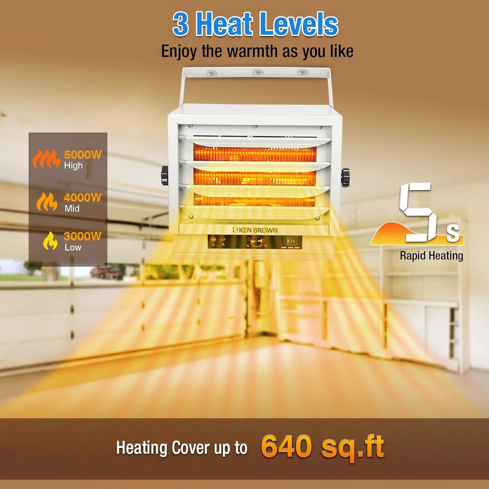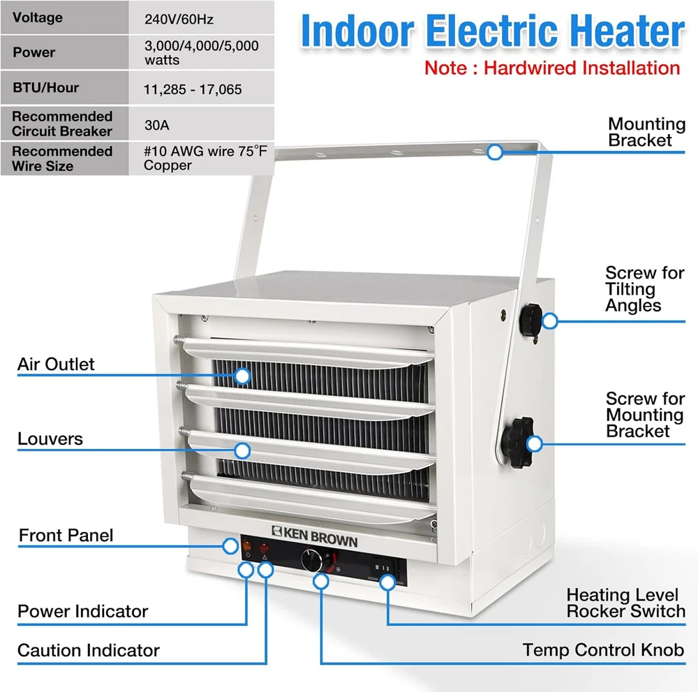 Store New Arrivals Add to Favorite View Feedback Contact 3000/4000/5000 Watt Electric Garage Heater, 240V Hardwired Fan-Forced Ceiling Mount Shop Heater with 3 Heat Levels & Thermostat, Ideal for Garage, Workshop, Greenhouse Description Amperage 20.83 Amps Room Type Living Room, Bedroom Voltage 240 Volts Indoor/Outdoor Usage Indoor Mounting Type Wall Mount or Ceiling Mount Color white Special Feature Thermostat Power Source Electric Heating Method Forced Air Item Weight 24.4 pounds Batteries required No Item Weight 244 Pounds Heat Output 17065 British Thermal Units Size 5000-Watt(hardwired) Burner type Radiant Recommended Uses For Product Garage Heating Coverage 592 square feet Form Factor Ceiling Mount Product Dimensions 12.2"D x 16.15"W x 12.8"H Fuel Type Electric 【CONVENIENT CONTROLS】Electric garage heater heats up more efficiently with up to 5000W working power, heat within 5 second,reaching your desired temperature immediately, letting you feel fast, balmy heat straight away. Dual knob allows you to easily adjust the temperature to adjust the right level for your space and to turn the ceiling mount heater on and off quickly. Note:This electric heater does not come with a power cord. 【TARGETED HEATING】Electric garage heater includes adjustable mounting bracket for optimized positioning. Louvers and a variable mounting angle direct airflow where it is needed most. Our garage heater combines fan-forced design helps to distribute warmth throughout the room. 【BUILT TO LAST】Our electric garage heater is made of heavy gauge steel housing that stands up well to the temperature fluctuations in areas that are poorly insulated. In addition, our electric shop heaters are meticulously fashioned from V0 flame-resistant materials to ensure your safe use. 【SAFETY PROTECTION】Your security remains our utmost concern. This garage heater built-in thermostat allows you to adjust the temperature range 10℃ --35℃(50℉--95℉). The overheat protection sensor detects when the electric garage heater has overheated on the inside and switches it off automatically to help prevent damage to the unit. When you turn off the power, the heater will delay 30 seconds shut down after the temperature comes down. The ETL certification underscores its commitment to your safety and eliminate any potential hazards. 【SPACE-SAVING DESIGN】The electric garage heater is designed for wall mounted or ceiling mounted and 240v hardwired installation, which saves valuable floor space in a packed warehouse, workshop, shop, garage or storage area. 【HARDWIRED INSTALLATION】Our garage heater must be grounded and hardwired connection (240-Volt A.C.) for installation. The heater need to be installed by a certified electrician. For 5000W garage heater, requires 240v circuit with 30 amp breaker and #10 AWG wire. 【NOTE】This garage heater does not come with a power cord. Product Description 1 Meet Your Need 2 Thermal Design 3 Instant Warm-up 4 Widespread Warmth Heats Faster. Runs Safer. Installation for KEN BROWN Electric Garage Heater Specifications ABOUT US We offer the best prices around on high quality products. Our E-store includes media such as books, movies, music and games while offering electronics, toys, sporting apparel, clothing, tools, general home, garden items and more. SHIPPING We are always working hard to ensure your package arrives as soon as possible. Please understand that some factors like weather, high postal traffic, and the performance of shipping companies are outside of our control. We offer free shipping to the lower 48 states and ship within 2 business days of payment, usually sooner. We do not accept P.O. Boxes. Please provide a physical address. For shipping outside of the continental USA, we only use eBay's Global Shipping Program.The item is shipped to KY and then sent to the rest of the world. International customers are responsible for all duties and taxes. Continue to check out in order to calculate costs for shipping the item to your country. Messages regarding eBay's Global Shipping Program MUST be directed at eBay EXCLUSIVELY. RETURNS We offer a 30-Day Return Policy on items which you are not completely satisfied with. You have the option for a full-refund or an exchange of the item. No returns are available on items shipped outside of the USA. PAYMENT We accept PayPal. CONTACT US This page content is yet to come Please ad us to your favorite seller and visit again later Thank You CUSTOMER SATISFACTION We try our very best to make sure every customer is completely satisfied. If there's a problem, message us! We're happy to help. WE ACCEPT Copyright © 2021 AutoDS. | All Rights Reserved