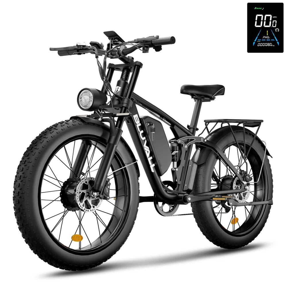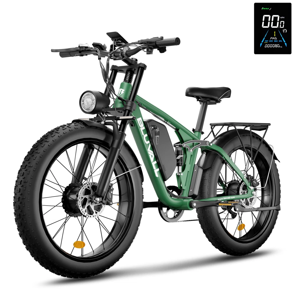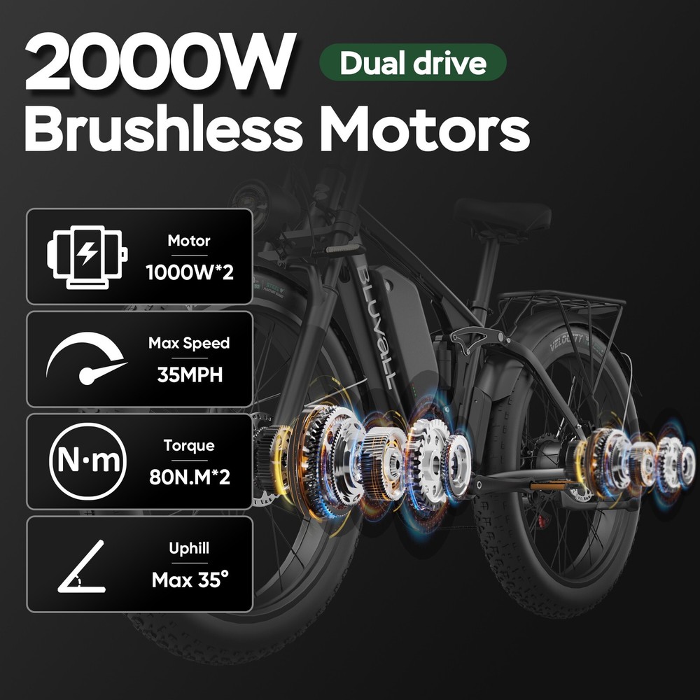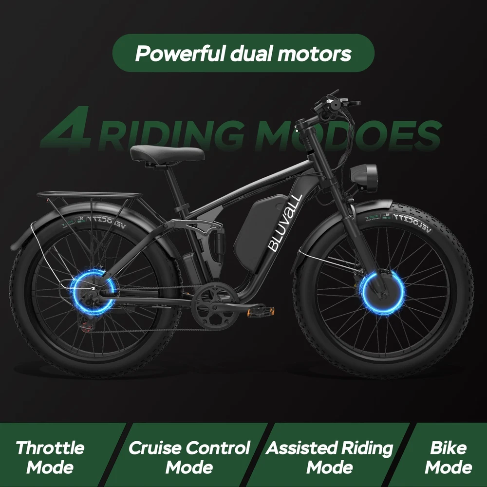Specification: V1 Double Engine Electric Bicycles,(Front 1000W, Rear 1000W Brushless Motor), 52V 22.4AH Battery Waterproof Wiring, 7 Speed MTB 26" 1. Wheel size: 26" 2. Frame: 18"" Aluminum Alloy 6061 3. Handlebar Sets: Aluminum Alloy with Matte, H31.8*680,S31.8*90, SP31.6*350mm 4. Fork: Dual Crown Suspension, Rear shock 1000 pounds 5. Shifting Lever: SHIMANOTX50-7,SHIMANOTZ30 & TY500 7PS 6. Crank sets: Aluminum alloy, Square hole,48T 7. Brake: Brand Logan Hydraulic oil Disc brake 8. Tire: CHAOYANG 26"" * 4.0 9. Riding Mode: Electric Power Assist (5shifts); Pure Electric (5shifts); Pure Human riding 7 Speed, Cruise function 10. Travel Range: Electric Power Assist 40~60 Miles 11. Max Speed: 35MPH,Battery Charging Time: 5~8 hours 12. Monitor: EB350 Middle LCD digital display The item is UL 2849 certified with a link to the UL Product iQ < https://productiq.ulprospector.com/en > Contact US: Working Time: Monday - Friday (GMT+8 9:00am - 6:00pm) Saturday & Sunday - Closed ALL Messages will be replied to within 24-48 hours. If you run into any issues and need help, please send the following to us: 1. Photos of the frame number and motor code 2. A detailed description of the problem. 3. Related pictures and Video(s) showing the problem if available. Regarding the video submission, since there are limitations on eBay for sending videos, Plese going to our Bluvall official website and contact our customer service, Our technical team will quickly figure out the problem and offer a solution.