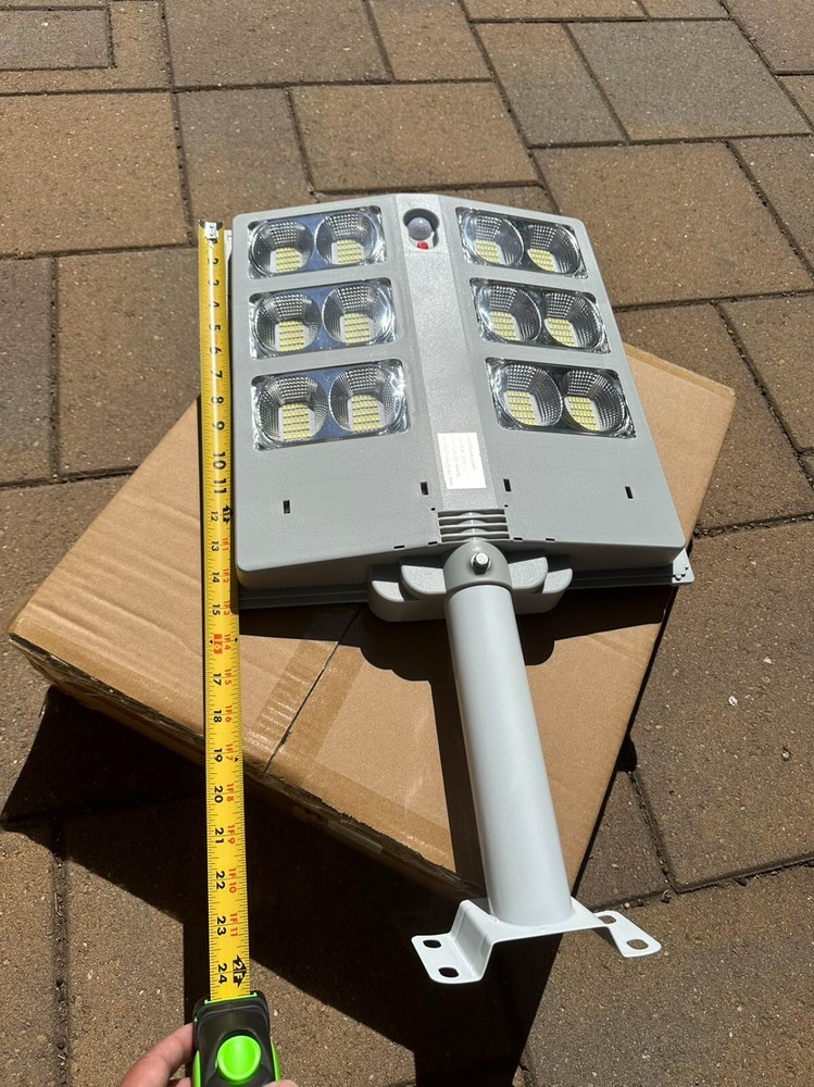 Solar Street Lights Super Bright LED Garden Outdoor Lamp Sensor+Radar+Remote Control,Wall Pole Mount Features & Advantages: 【EASY MOUNTING】 Solar street lights easy installation, screw fixing, dependable operation without the need for wiring or trench. It can be mounted on wall or pole easily (supported pole diameter: 1 inch to 3 inches, suggested fixed height: 13-16.4ft ft ). Notice: Please turn on the outdoor solar gutter lights before installation. 【FASTER CHARGING】 Solar lights outdoor environmental protection and energy saving, polycrystalline silicon solar photovoltaic panels have high photoelectric conversion efficiency. High conversion of solar energy, to be fully charged in only 4-6 hours. 【LONGER LIFETIME AND SAVE MONEY 】 The LED street light lamp is high power LED chip, low power consumption, high brightness, low light decay, energy saving and environmental protection. Use a large capacity LiFePO4 lithium battery with a long lifetime up to two years, the battery can be removed and replaced by itself, eliminating the need to frequently replace your fixture, save installation and maintenance and electricity bills costs. 【RADAR SENSOR& SUNLIGHT CONTROL】 Solar flag pole light built-in motion sensor and sunlight control regulates light automatically (turn on at dusk, turn off at dawn). LED flood light outdoor turn 100% brightness mode in 2 seconds when motion is detected. It reverts back to 30% energy saving mode again if people out of the detected area. 【WATERPROOF IP67】 The Outdoor street light is ABS plastic anti-UV lamp body and new housing inner design with individual sealed boxes for batteries, controller and outer sealed rubber ring protect from water leaking. Specification: Wattage: 3000W Number of leds : 360pcs Material: ABS plastic + PC Waterproof grade: IP65 Full power lighting: 14-16hours Installation height: 4-6m Product function: light control + intelligent remote control + human body radar Battery capacity: 3.2V/15000ma Solar panel: 15W/6V Product size: 24*14*4 inch