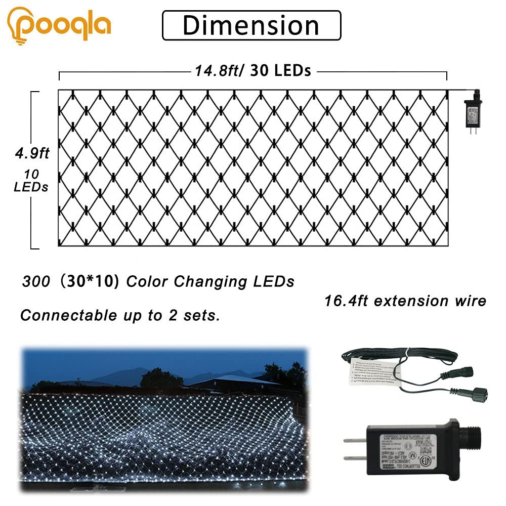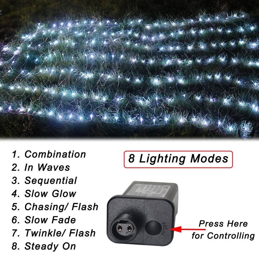 Net Lights, 300LED Christmas Outdoor Mesh Light, 14.8x4.9 ft Fairy String Mesh Light with 8 Modes Green Wire, Connectable Waterproof Decorative Light for Bushes Tree Garden Halloween, Cool White 8 Lighting Modes: Combination, In Waves, Sequential, Slow Glow, Chasing/Flash, Slow fade, Twinkle/Flash, Steady on(No remote control). Press the button on the adapter to control the flashing modes Extendable Christmas Net Lights: End-to-end connection design increases the coverage of the led mesh lights. Connect up to 2 sets. Each lamp provides a separate 16.4 ft extension cord. Each net light is of 300 LED, 14.8*4.9 ft Outdoor Independence Day Decorative Lights: IP44 Waterproof, well net light for indoor & outdoor decoration. Designed with green wire, which can be well hidden in shrubs or trees. The power adapter is not waterproof High Quality Purple Halloween Lights: Made of high quality PVC plastic, flexible. Super bright and low power consumption LED light. Package Include- 1x 300 LED Net Lights; 1x UL Plug with Control Button; 1x Manual Widely Application: The net light can be easily use on your front yard, garden, roof, ceiling, terrace and irregular bushes. A perfect light decoration to Christmas, party, wedding, home, window, festival, shows, commercial building, shopping center etc