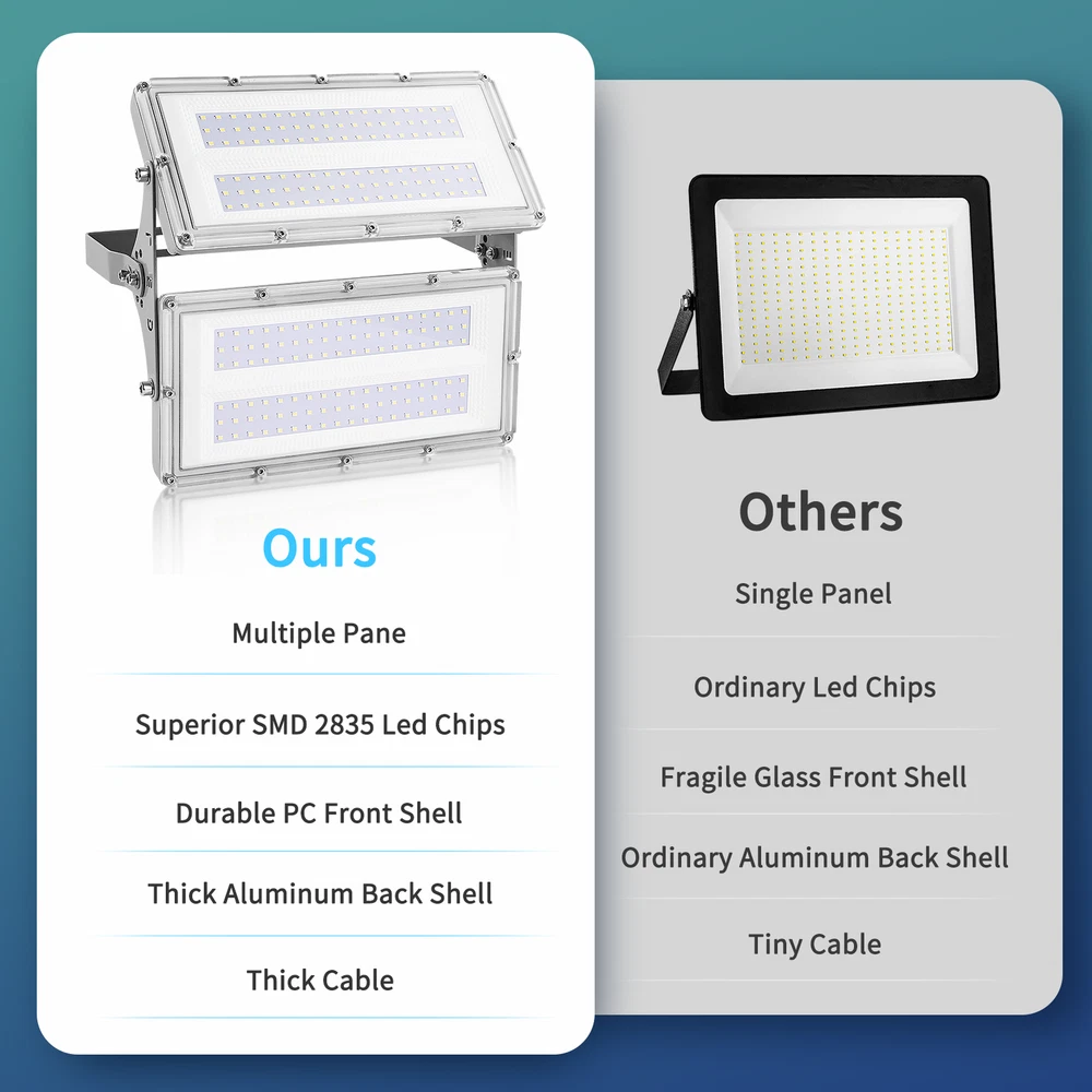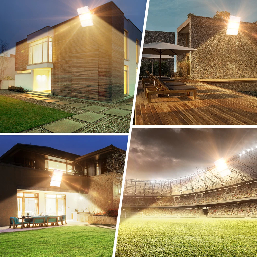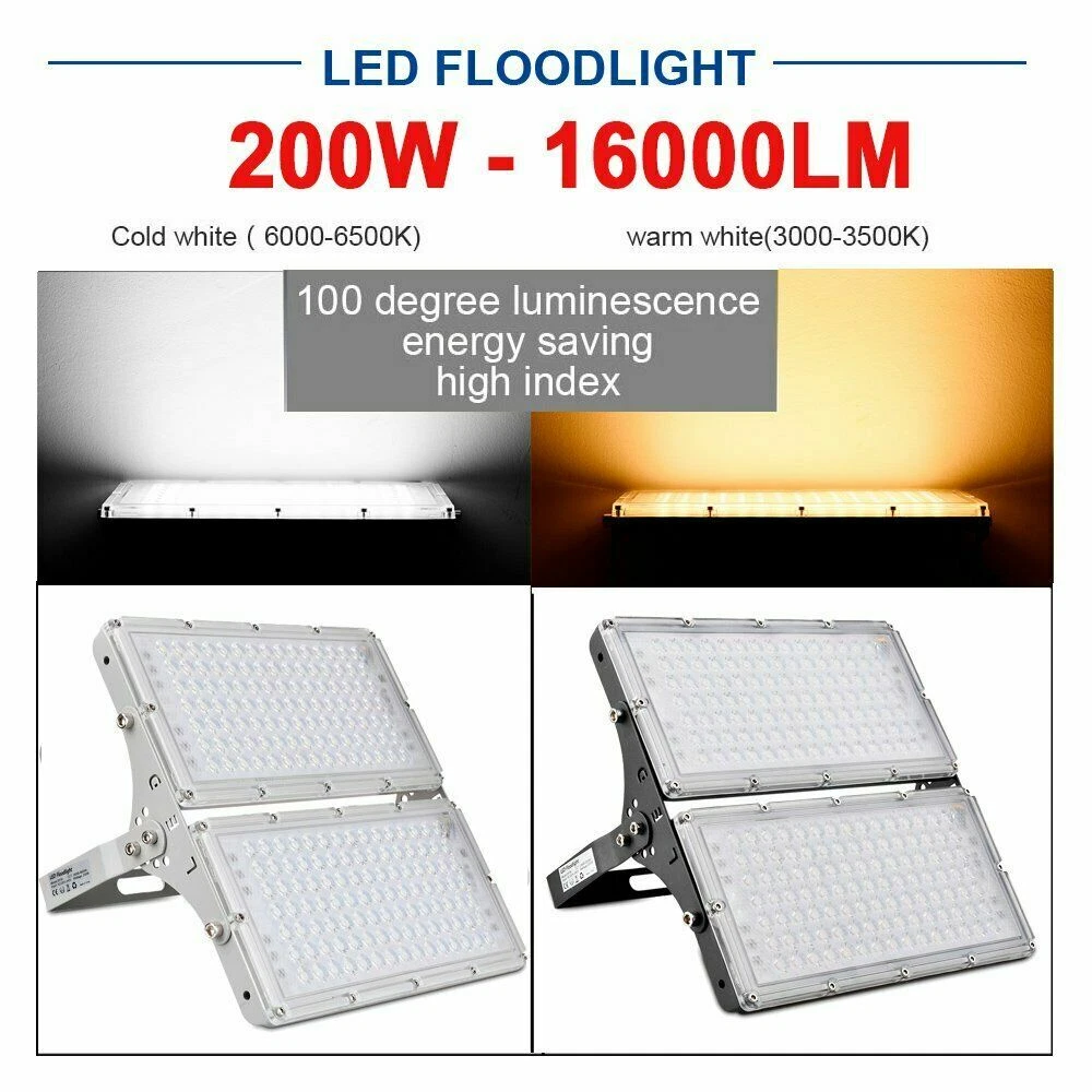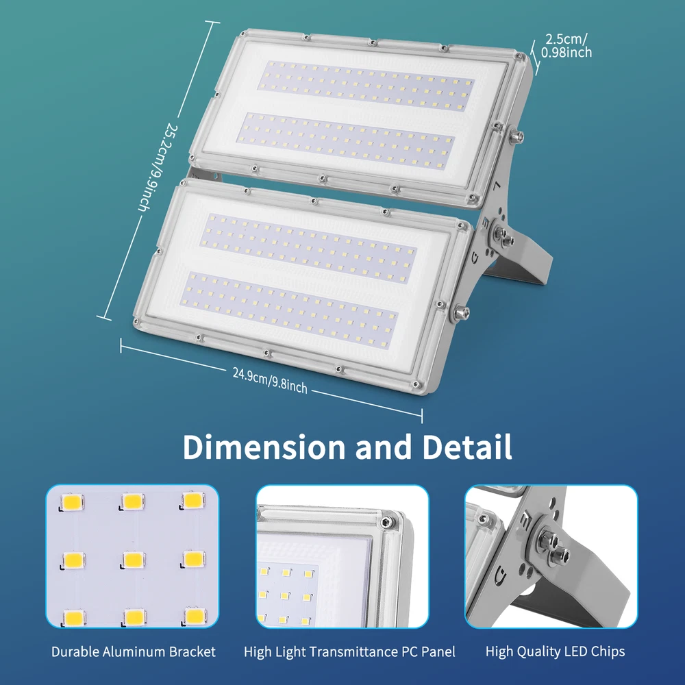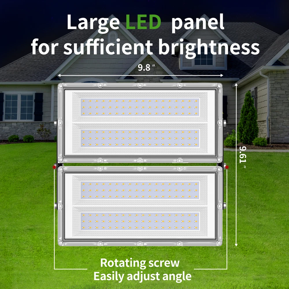 LED floodlights provide high performance, long life and energy saving in a simple, non-decorative traditional appearance fixture. Our Lighting introduces the latest solid-state LED technology to the market and uses the Helios technology we are applying for a patent, which provides a real lighting experience, both in the environment and in the appearance. LED floodlights guarantee better, cheaper and healthier lighting than traditional fluorescent lamps, and can easily be replaced by any existing lamps. Specification: Power:100W 200W 300W Input Voltage:110V Type:105pcs/210pcs/315pcs 2835 LED Type:LED Floodlight Lumens: 8000lm 16000lm 24000lm Color Temperture: Cool White( 6000-6500K) / Warm White(3000-3500K) Beam Angle:120° Material: Aluminium+PC Size (L*B*H): 100W: 249X112X25MM 200W:249X244X25MM 300W:249X366X25MM Life Span: >5,0000 S. Protection Grade:IP67 Certification: CE Approved & Rohs Compliant Energy Efficiency Class: A+ Feature: 1.Waterproof,IP67 2.Energy saving 3.Applicable to residential buildings, campuses, factories, parks, streets 4.Easy to install,Wall type, street lamp type Package: 1x LED Flood Light