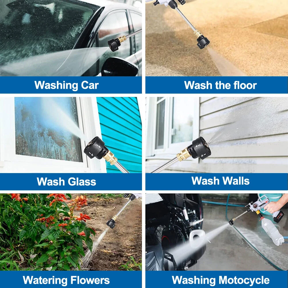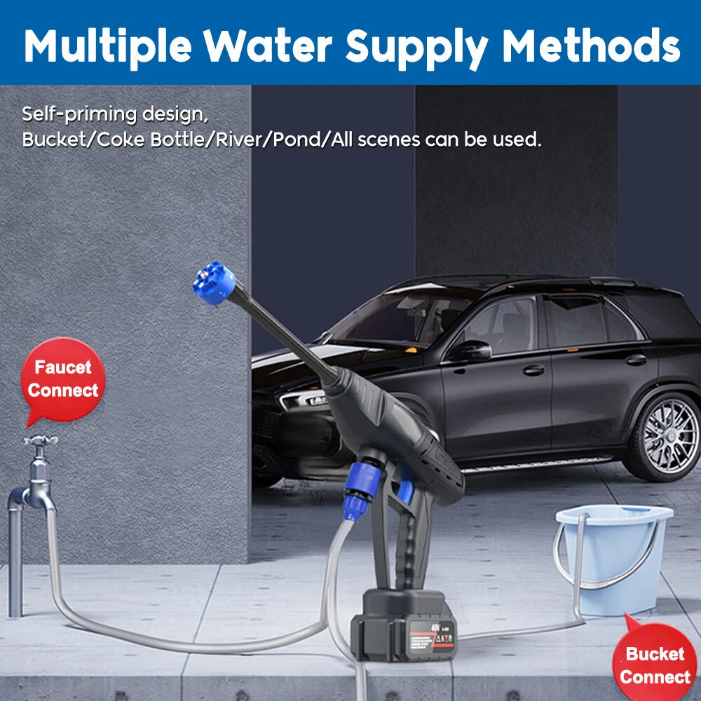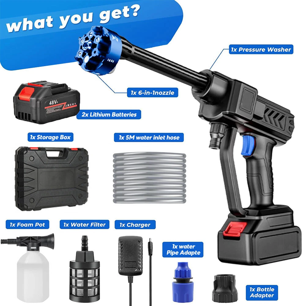 Features: 【Cordless Pressure Washer】 The Cordless pressure washer has a cordless and lightweight design that makes it easy to carry and work anywhere. Equipped with a powerful motor, it has a click speed of 20000rpm, a flow rate of 360L/H. Strong power and convenient cleaning. 【High efficiency and durability】 12000mAh battery provides stable power for the normal operation of the car washing machine, and the battery has a long service life. Fast charger with Long battery life. Batteries are suitable for most power tools of the same model. 【widely Application】 Portable Pressure washer can not only be used to clean all kinds of cars, bicycles, motorcycles, etc., but also can clean balconies, Windows, exterior walls, floors, fences, house walls, furniture and so on. 【Multifunctional Nozzle Cordless Portable Electric High Pressure Water Spray Gun Car Washer Cleaner Tool Descri ption: Material: ABS, Copper Power Supply: 48V, Lithium battery Charging Plug: US Battery Capacity: 2x 12000mAh Power: 300W Maximum Pressure: 50 BAR Maximum Flow Rate: 360 L/H Spraying Range: 8-10 meters Water Hose Length: 5m/16.4ft Water Source: Bucket / Faucet Self-priming Motor: Pure copper induction motor Scope of application: Car washing, watering flowers, watering vegetables, spraying, garden cleaning, etc. Features: 【Cordless Pressure Washer】 The Cordless pressure washer has a cordless and lightweight design that makes it easy to carry and work anywhere. Equipped with a powerful motor, it has a click speed of 20000rpm, a flow rate of 360L/H. Strong power and convenient cleaning. 【High efficiency and durability】 12000mAh battery provides stable power for the normal operation of the car washing machine, and the battery has a long service life. Fast charger with Long battery life. Batteries are suitable for most power tools of the same model. 【widely Application】 Portable Pressure washer can not only be used to clean all kinds of cars, bicycles, motorcycles, etc., but also can clean balconies, Windows, exterior walls, floors, fences, house walls, furniture and so on. 【Multifunctional Nozzles】 6 Water types adjustable, you can change and adjust different water discharge modes simply by rotating the nozzles.and use with foam buckets to meet your various cleaning tasks. Packaging Includes: 1 x Washer Gun 2 x 12000mAh Lithium Battery 1 x Charger (US) 1 x Water Hose (16.4FT) 1 x 6-in-1 Nozzle 1 x Quick Connector 1 x Lance 1 x Filter 1 x Foam Pot 1 x Manual Attention: 1. Due to manual measurement, please allow an error of 1-3 centimeters. Please ensure that you do not mind before bidding. 2. Due to different monitors, the colors may vary. Please understand. 3. Don't point at humans. 4. Do not disassemble, open, or cut the battery pack. 5. Do not short-circuit the battery pack. Do not casually place the battery in a box or drawer to avoid short circuits between the battery and other metal objects. 6. Do not expose the battery to high temperatures or open flames. Avoid storing in direct sunlight. 7. Do not remove the battery from its original packaging before use. 8. Do not use mechanical impact on the battery. Payment Delivery details Returns Contact us About us Payment Delivery details Returns Contact us About us Type Cold Water Pressure Washer Brand Unbranded Power Source Battery Maximum Pressure 435 psi Features Cordless, Integrated Carry Handle, Lightweight, On-Board Accessory Storage, Quick Connect, Soap Tank, Water Inlet Filter, 6-in-1 Multifunction Nozzle, 5 Meters Hose Product Line High Pressure Water Spray Voltage 110-240V, 50-60Hz Model Cordless High Pressure Washer Power 300 W Assembly Required No Manufacturer Warranty 1 Year Soap Tank Capacity 300 ml Items Included 1xWashing Machine, 2x Battery, 1xQuick Connector, 1x Charger, 5 Meter Water Inlet Hose, 1x Filter, 1x Soap Bottle, 1x Storage Box, 1x User Manual Color Black with Blue Material PP Item Height 8.86 in Item Length 16.3 in Item Width 2.95 in Year Manufactured 2022