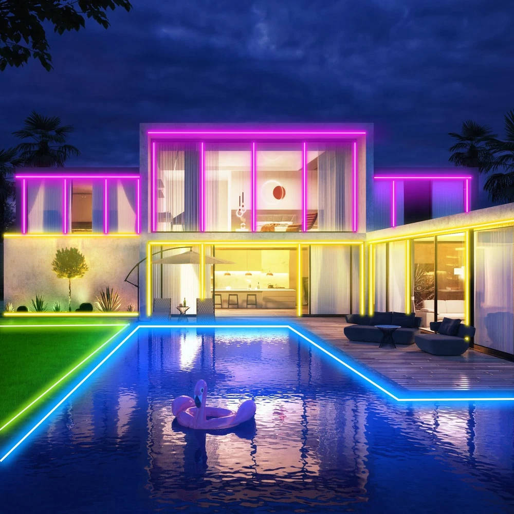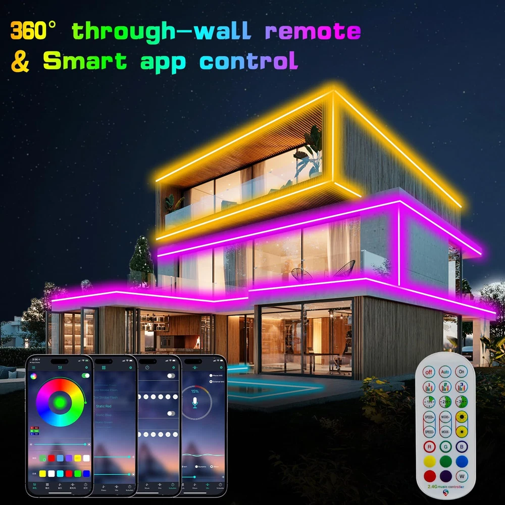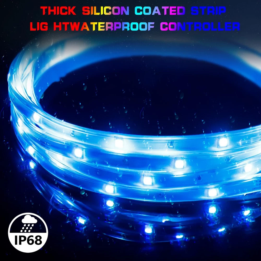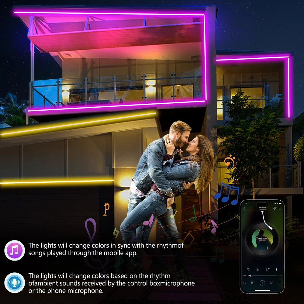 Our 300f LED strip lights come in 2 rolls, It offer a long option for adding decorative lighting to your outdoor spaces, No extra wiring, cleaner, simpler and more convenient These lights have a color changing feature that can be synced to music, The APP plays your favorite music and Outside Led Strip lights waterproof colors sync with the music. as well as a timer for convenient on/off control The DuoCo Strip App allows for easy control of the lights using your smartphone, and the included 2.4G RF remote has a control distance of up to 100ft Both the LED strip and control box are IP68 waterproof and come with strong double sided adhesive tape for easy installation This product includes 2 roll 150 Feet Waterproof Led Strip ,a UL listed 24V power adapter, a Control Box, a 2.4G RF Remote, User Manual