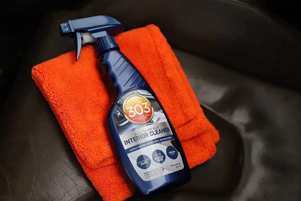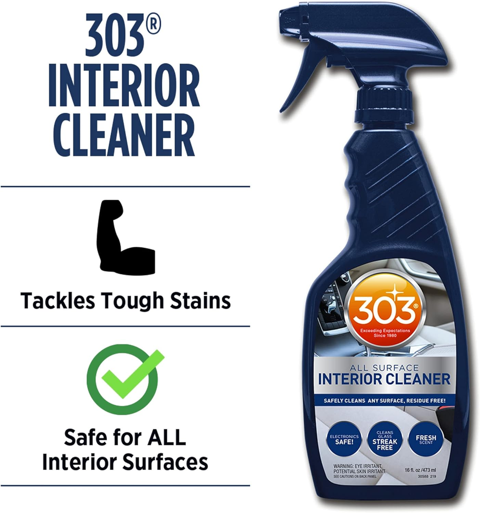 Electronics Safe – This Product Will Clean And Shine All Vinyl, Plastic, Leather, Rubber, Metal, Gauge Panels, Dashboards, Windows, And Door Panels In Your Vehicle. You Can Also Spray This Cleaner On Any Electronic Device You Own. We Understand That Touchscreens Are All Around Us, And We Wanted To Develop An Easy Cleaning Method For Them. Simply Spray This Multi-Purpose Cleaner On Your Lcd Screens Or Directly Onto A Microfiber Towel Or Cloth, Wipe Dry, And Watch Every Stain And Smudge Disappear Streak Free – This Cleaner Not Only Easily Removes Dirt, Stains, And Smudges, But It Also Cleans Windows And Glass Without Leaving Any Streaks Or Residue Behind. Keep This Product Around To Use On Your Windshield To Reduce Fog Buildup. It Is Quite Simple; This Product Will Leave Behind A Spotless Sparkle In All Cars And Trucks Versatile – 303 Automotive Interior Cleaner Is Not Just For Your Car. It Can Also Be Brought Inside Your Home And Used On Every Screen From Your Laptop And Computer To Flat Screen Lcd Television And Any Mobile Device. Nothing Is Worse Than Looking At A Dirty Screen. Protect And Clean Your Devices With This Fresh Smelling Detailer Directions – Shake Well Before Use. Product Can Be Sprayed Directly Onto Surface, Or Onto A Clean Microfiber Towel. Wipe Or Scrub Surface To Remove Dirt Or Stain. Wipe Dry With A Microfiber Towel. For Best Results, Use Regularly. Safe For Use On All Interior Surfaces, Including Vinyl, Plastic, Leather, Upholstery, Carpets, Glass, And Even Lcd Screens For over 40 years, 303 Products have provided premium protection for your cars, boats, and beyond. All 303 Products are good for 2 years after the packaging date on the bottle – YYDDD 303 Automotive Interior Cleaner is a great cleaner for all of the interior surfaces of your vehicle. It is gentle and safe, but still has the strength to clean away tough stains. It lifts dirt from the surface when sprayed on, and wipes off residue free. This formula also helps repel dust and dirt, and leaves a clean natural appearance on the surface after using. 303 Automotive Interior Cleaner is safe and effective on: vinyl, plastic, rubber, leather, fabrics/upholstery, carpets, glass, and even LCD screens. Instructions: Shake well before using. Product can be sprayed directly onto surface, or onto a clean microfiber towel. Wipe or scrub surface to remove dirt or stain. Wipe dry with a microfiber towel. For best results, use regularly. Safe for use on all interior surfaces, including: vinyl, plastic, leather, upholstery, carpets, glass, and even LCD screens.