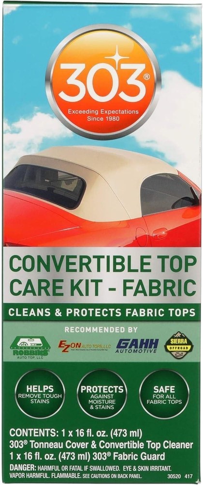 303 Convertible Top Cleaner Care Kit Clean Protect Convertible Car Fabric Tops Item Description 🧿Brand Does not apply 🧿Type Does not apply 🧿Surface Recommendation Fabric 🧿Item Form Spray 🧿Item Volume 16 Fluid Ounces 🧿UPC 711181076431 Hith Tech Fabric Guard restores oil & water repellency 303 Convertible Top Cleaner Care Kit Clean Protect Convertible Car Fabric Tops With this kit, proper care of your fabric convertible top is easy! It will save you money and add years to the life of your convertible top. This kit contains both 303 Tonneau & Convertible Top Cleaner, to help remove stains, dirt and debris, and 303 Fabric Guard to help restore water and stain properties to the fabrics, to keep your convertible top looking newer, longer. 303 Tonneau Cover and Convertible Top Cleaner is formulated to clean and brighten Tonneau covers, fabric and vinyl convertible tops and car bras. Recommend to use prior to treating with 303 Fabric Guard or Protectant. 303 Fabric Guard will restore lost water and stain properties. Recommended by leading outdoor fabric manufacturers PAYMENT SHIPPING RETURN We accept the following payment methods: Credit and Debit Cards Please make your payment within 48 hours of purchase to ensure prompt processing and shipment. Orders ship within 4 to 5 business days after payment. We offer FREE FAST SHIPPING! We offer a 30-day return policy for all items. If you are not completely satisfied with your purchase, you may return the item within 30 days of receiving it for a full refund or exchange. The buyer is responsible for return shipping costs.