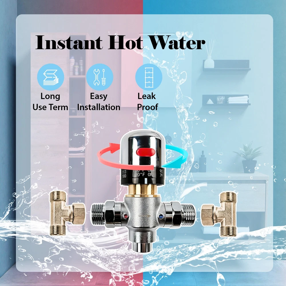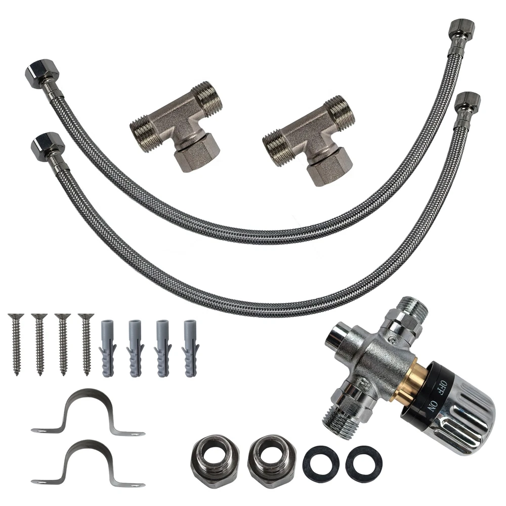 Adjustable Temperature Sensor Valve Kit Bypass For Instant Hot Water System Product description Upgraded 304 Stainless Steel Construction Adjustable Thermostatic Control (68℉- 118℉): Easily set your perfect water temperature. The thermostatic bypass valve maintains warmer water in your pipes, delivering instant hot water to your faucets while saving water and reducing wait time. No-Return-Line & Electricity-Free Bypass Technology: Our innovative bypass technology requires no dedicated return line or electrical outlet under the sink. It helps eliminate wastewater by efficiently recirculating water. Note: Compatible with tank-type water heaters only. Easy to Clean & Maintain Design: Features a removable sensor valve for quick disassembly and cleaning. The built-in filter screen on the hot water inlet traps sediment and impurities, preventing blockages and extending the product's service life. Broad Pump Model Compatibility: A direct and reliable upgrade from plastic valves. This professional kit is fully compatible with a wide range of popular recirculating pump models (e.g., 500800, 500805) Package Contents: One adjustable temperature sensor valve, two stainless steel fixture, two 50cm(19.69)water supply line, two 1/2" to 3/8" adapter with rubber washer, four plastic expansion bolt and self tapping screw
