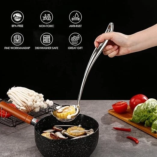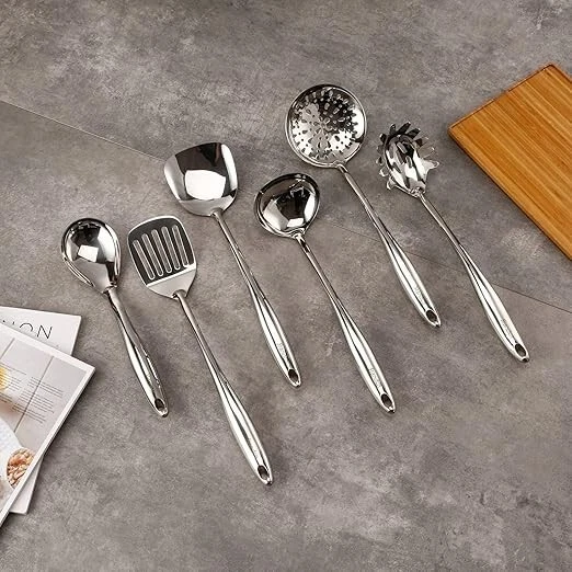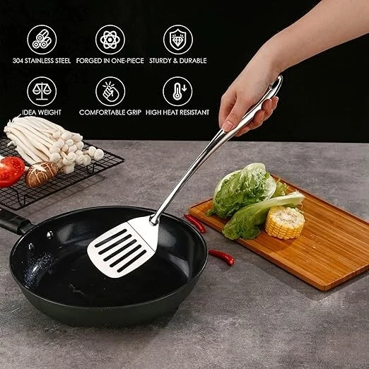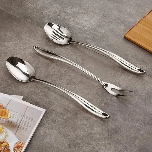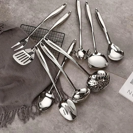 Crafted by Standcn, this 9-piece kitchen utensil set is a sleek addition to your culinary toolkit. The pieces are fashioned from durable 304 stainless steel, ensuring a high shine that remains resilient against the demands of daily use. With a package dimension of 16.3x4.88x4.8 inches, these utensils are compact enough for easy storage yet large enough for comfortable handling. The set includes a variety of serving and cooking tools, all designed with a user-friendly approach in mind. The utensils are finished in a classic silver color that complements any kitchen décor. Weighing in at a mere 3.42 pounds, this set is lightweight, making serving and cleaning a breeze. Whether you're hosting a dinner party or cooking up a storm, these utensils are up to the task.
