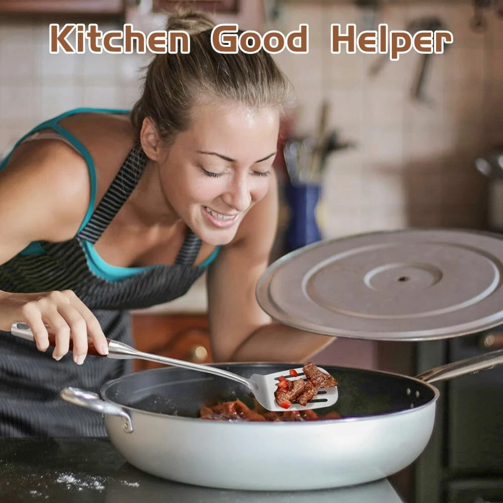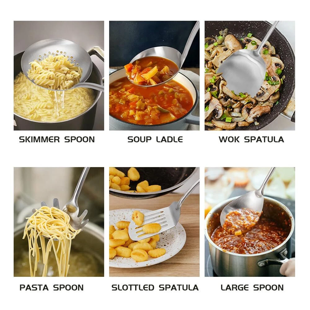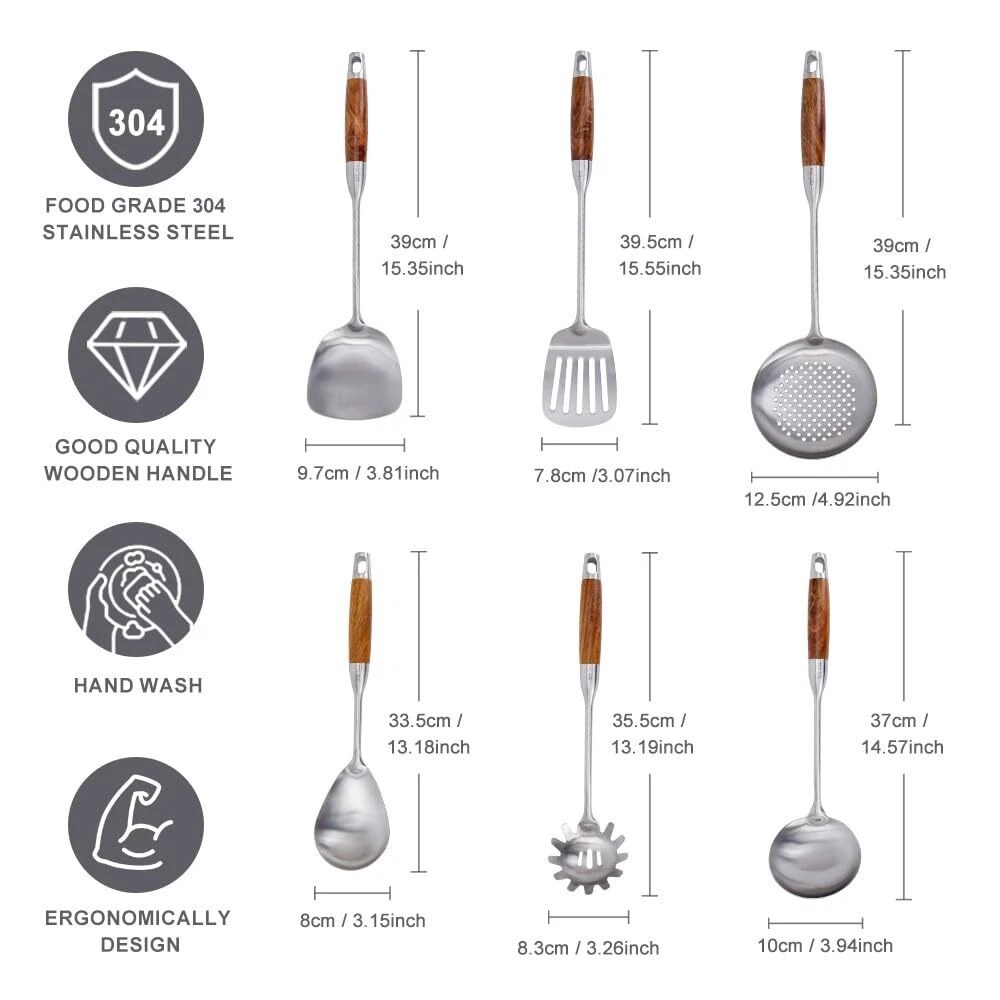【High Quality Food Grade 304 Stainless Steel Material】Stainless Steel Kitchen Utensils Set is made of good quality 304 stainless steel material, solid strong and durable, ergonomic rosewood handle design is easy to grip and heat-resistant, relax your hands while you are cooking. 【6-Pieces Professional Metal Cooking Utensils Set】: 1 wok spatula, 1 skimmer spoon, 1 slotted spatula, 1 soup ladle, 1 spaghetti spoon, 1 large spoon. Highly polished to a silver matte brushed finish, stain and rust resistant, non-stick, easy to clean. 【Hand Wash Only&Space Saver】Due to the handle is made of natural rosewood, in order to maintain the best use of performance and longer service life, so it is recommended to hand wash, the hanging loops is to facilitate hanging, easy to wash and hang up to dry naturally, and save space! 【Good Choice for Your Kitchen】This whole set of stainless steel kitchen spatula set is very suitable for daily cooking, no more no less just right, to meet your daily cooking needs, every day look at this beautiful spatula set, let you reap the benefits of a good mood at the same time, cooking a delicious meal! 【Perfect for Professional Chefs & Home Use】The entire set of products in a single size between 13-15 inches, made of the premium raw materials, ideal length for cooking, suitable for the professional chefs or home use.