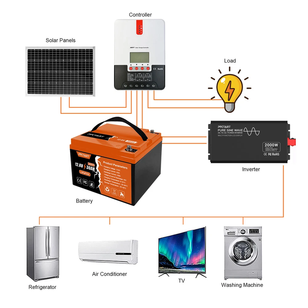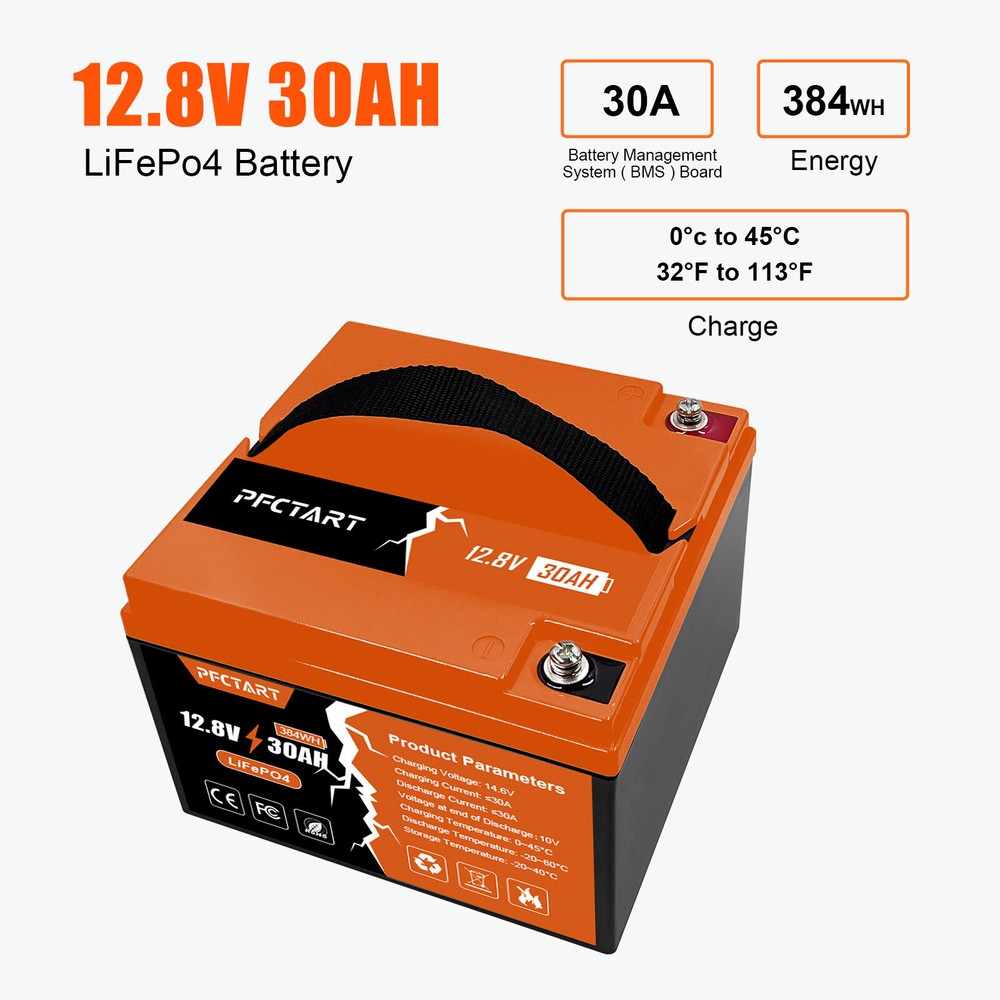 Features 【Automotive Grade Lithium Battery】 PFCTART lithium iron batteries have exceptional quality since they are manufactured by Automotive Grade LiFePO4 Cells with higher energy density, more stable performance & greater power. Highest-level safety based on UL Testing Certificate for the cell inside the battery.This makes li-iron batteries perfect for solar home, RV, campers,motor homes, off-grid applications. 【10 Years lifetime】PFCTART LiFePO4 battery provides 4500+ cycles, which is more than 10 times to Lead Acid with 300~600 cycles. PFCTART LiFePO4 battery has a 10-year service life, three times longer than the Lead Acid’s 3-year lifetime. 【95%* Efficiency】 PFCTART LiFePO4 battery’s flat discharge curve holds above 12.8V for up to 95%,of its capacity usage, providing astronomical boosts in run-time compared to only 50% in Lead Acid. This product is your best choice for outdoor camping power and indoor easy installation. 【1/3* Lightweight】 PFCTART LiFePO4 Battery weighs only 8.81 lbs for one module, only 1/3* the weight of lead acid batteries, which makes it an easy choice for RVs, Marine and Off-Grid Applications when mounting or mobility is in the consideration. 【100% Protection】 PFCTART LiFePO4 battery has built-in BMS (Battery Management System) to protect it from overcharge, over-discharge, over-current, and short circuit with excellent self-discharge rate. Built-in high-temp cut off prevents charging over 167 °F (75 °C). Without memory effect, no matter what state the battery is, it can be used as soon as it is charged. PFCTART LiFePO4 battery is IP65 level waterproof, which set you free from worrying to install indoors or outdoors. Specifications Battery type: LIFEPO4 MODEL: 30Ah 12.8V(4S5P) Rated capacity: 30Ah(384WH) Normal voltage: 12.8V Discharge termination voltage: 10.0V Charging voltage: 14.6V Internal resistance: ≤180mΩ Single cell: IFR 32700 3.2V 6000mAh Standard charging. Continuous current: 0.2C5A Continuous voltage: 14.6V Cut-off current: 0.01 C Standard discharge: Constant current 0.2C5A end voltage 10.0V Max. charging continuous current: 30A Maximum discharge continuous current: 30A Operating temperature range. Charge: 0~45℃ Discharge: -20~60℃ Product size: 177*167*125mm Weight : 4kg BMS Protection Cell overcharge detection voltage:3.90V±50mV Cell overcharge recovery voltage:3.80V±100mV Cell over-discharge detection voltage:2.00V±100mV Cell over-discharge recovery voltage:2.50V±100mV Rated operational charge current:30A Over current detection:60±5A PCM impedance:≤50mΩ Note It does not have series/parallel protocol, please do not use it for multiple series or parallel installations.