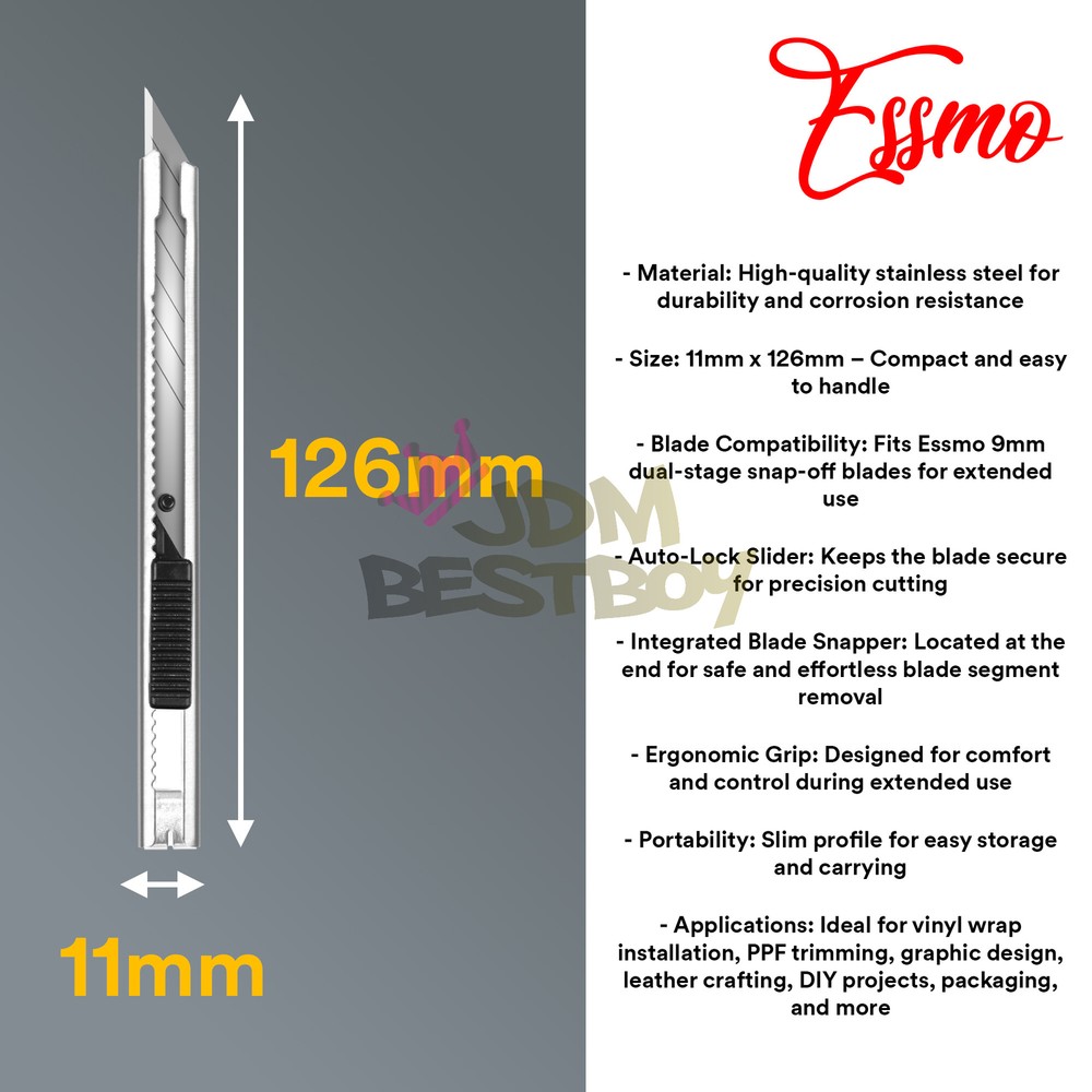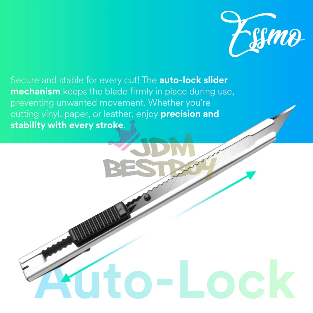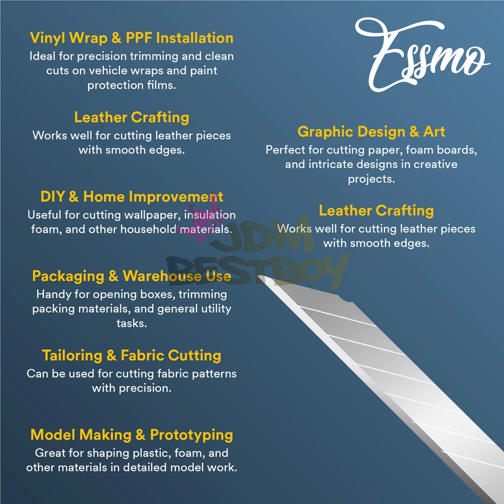 Product Overview 30 Degree Knifes Blade Stainless Utility Precision Razor Vinyl Wrap Tint Tools Store Categories Store Categories Automotive Accessories Adhesive Tape Body Kit Decals & Stickers Door Guard & Trim Engine Accessories Exterior Accessories Fastener Handbrake Interior Accessories Lighting Mirror & Mirror Cover Motorcycle Shifter Steering Wheel & Cover Tire & Wheel Headlight Tint Heat Transfer Vinyl (HTV) Bundle Set Chameleon (ADC) Chrome (DS) Flock (DF) Glitter (DG) Glow in the Dark (GD) Matte (DP) Neo Chrome (NC) Pattern (SP) Printable (DD) Rainbow Reflective (RT) Paint Protection Film (PPF) Shipping Supplies Vinyl Wrap 3M Architectural Avery Brushed Aluminum Camouflage Carbon Fiber Chameleon Chrome Coral Craft Galaxy Dust Glitter Gloss Holographic Matte / Satin Metallic Patterned Pearl White Space Candy Velvet Vinyl Tools Window Film Architectural Window Film Frosted Window Film One way Vision (OWV) Solar Window Tint Window Tint Other Payment Description The ESSMO 30 Degree Knife is crafted for precision, featuring an acute 30° blade angle that delivers a sharp, clean cutting edge. Ideal for detailed and delicate work, this knife is a top choice for professionals handling specialized tasks. Whether you're installing paint protection film (PPF), working on vinyl wrap applications, or performing other precision-based projects, the ESSMO knife ensures control, accuracy, and high-performance results every time. Features: Perfect for wrapping, cutting vinyl, wood, window films, vinyl graphics, and more. Suitable for both personal and industrial use. Acute 30° blade angle for precise cuts. Automatic blade lock for enhanced safety and security. Stainless steel blade channel securely holds the blade in place. Convenient pocket clip doubles as a blade snapper. Tool-free blade change for quick and easy replacements. Each blade provides up to 7 cutting edges. Shipping Policy Payment Returns Policy About Us Shipping Policy Fast shipping from Industry, CA Once your payment clears, most orders are processed & shipped out either the same or next business day. Please ensure that the shipping address you provided at checkout is accurate. We are not responsible for un-deliverable or wrong shipping address issues. We ship all of our items either via USPS / FEDEX. Please notice that Sat, Sun and Public Holiday DO NOT count as a business day. For International buyers: International shipping ETA 21-45 business days, please allow up to 1 month for custom clearance in some area / country. Import duties, tax and charges are not included in the item price or shipping charge. These charges are the buyer’s responsibility. Please check with your country’s customs office to determine what these additional costs will be prior to buying. Payment Pay secure with any major credit card through PayPal. Please pay within 3 days after auction ended. Please confirm the mailing address correct when you make a payment. Feedback will be left automatically after received buyer feedback. Please contact us before leaving a Negative & Neutral feedback. We would try our best to help you solving any problem. Please feel free to contact us through EBAY message if you have any question, and we will get back to you within 24-48 hours. Returns Policy The RMA Number will be same as the EBAY ITEM NUMBER. Please write it with your EBAY ID, Date of purchased on piece of paper or outside the box, and return it with the item. A 25% restocking fee will be charged. Shipping & Handling fee is not refundable. Any faulty due to improper installation or improper use will NOT be covered by the warranty. Any physical damage such as soldering or modified bases will void the warranty too. Buyer pay for all return shipping postage fee. All return & exchange must be in NEW & UN-USED condition About Us We are trying our best to describe all details of the product here. Please feel free to contact us through EBAY message if you have any question, and we will get back to you within 24-48 hours. Our business hours are Monday to Friday 10am to 6pm PST Customer satisfaction is our priority. If you are not happy with the item that you purchased, please first contact us for more information. We will try our best to solve the problem with you. On Jun 24, 2025 at 17:26:46 PDT, seller added the following information: