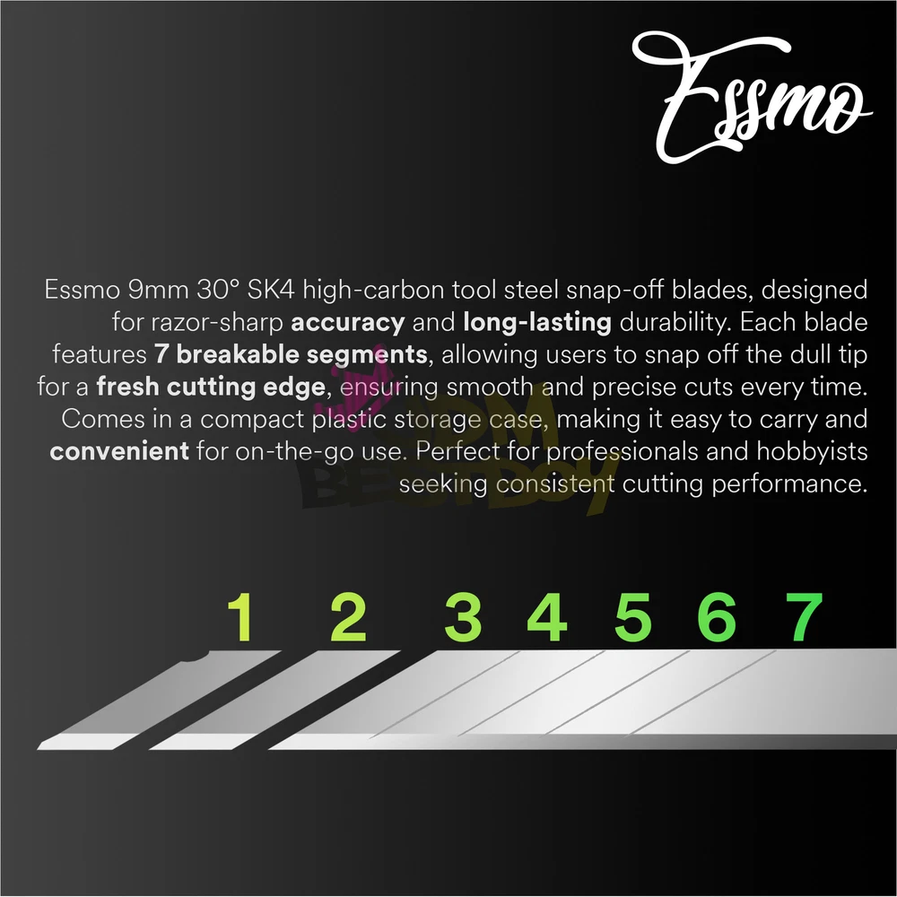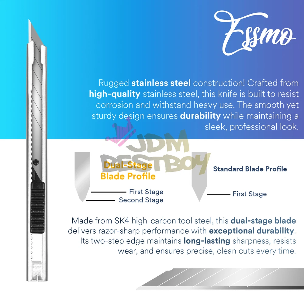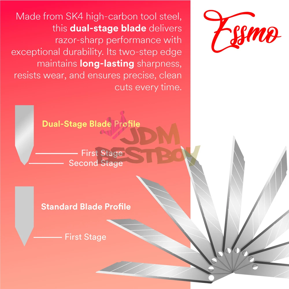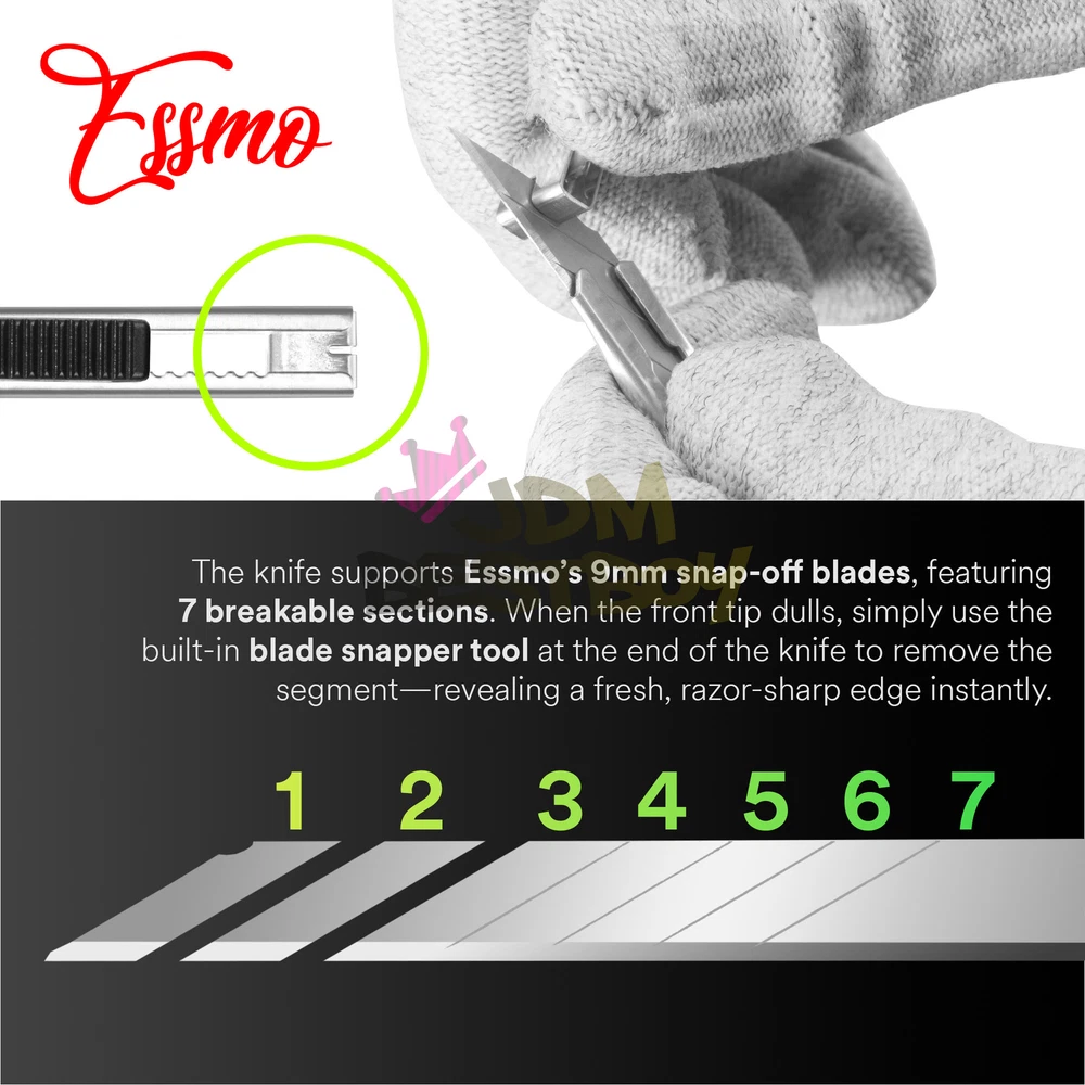 Product Overview 30 Degree Knifes Blade Stainless Utility Precision Razor Vinyl Wrap Tint Tools Store Categories Store Categories Automotive Accessories Adhesive Tape Body Kit Decals & Stickers Door Guard & Trim Engine Accessories Exterior Accessories Fastener Handbrake Interior Accessories Lighting Mirror & Mirror Cover Motorcycle Shifter Steering Wheel & Cover Tire & Wheel Headlight Tint Heat Transfer Vinyl (HTV) Bundle Set Chameleon (ADC) Chrome (DS) Flock (DF) Glitter (DG) Glow in the Dark (GD) Matte (DP) Neo Chrome (NC) Pattern (SP) Printable (DD) Rainbow Reflective (RT) Paint Protection Film (PPF) Shipping Supplies Vinyl Wrap 3M Architectural Avery Brushed Aluminum Camouflage Carbon Fiber Chameleon Chrome Coral Craft Galaxy Dust Glitter Gloss Holographic Matte / Satin Metallic Patterned Pearl White Space Candy Velvet Vinyl Tools Window Film Architectural Window Film Frosted Window Film One way Vision (OWV) Solar Window Tint Window Tint Other Payment Description The ESSMO 30 Degree Knife is crafted for precision, featuring an acute 30° blade angle that delivers a sharp, clean cutting edge. Ideal for detailed and delicate work, this knife is a top choice for professionals handling specialized tasks. Whether you're installing paint protection film (PPF), working on vinyl wrap applications, or performing other precision-based projects, the ESSMO knife ensures control, accuracy, and high-performance results every time. Features: Perfect for wrapping, cutting vinyl, wood, window films, vinyl graphics, and more. Suitable for both personal and industrial use. Acute 30° blade angle for precise cuts. Automatic blade lock for enhanced safety and security. Stainless steel blade channel securely holds the blade in place. Convenient pocket clip doubles as a blade snapper. Tool-free blade change for quick and easy replacements. Each blade provides up to 7 cutting edges. Shipping Policy Payment Returns Policy About Us Shipping Policy Fast shipping from Industry, CA Once your payment clears, most orders are processed & shipped out either the same or next business day. Please ensure that the shipping address you provided at checkout is accurate. We are not responsible for un-deliverable or wrong shipping address issues. We ship all of our items either via USPS / FEDEX. Please notice that Sat, Sun and Public Holiday DO NOT count as a business day. For International buyers: International shipping ETA 21-45 business days, please allow up to 1 month for custom clearance in some area / country. Import duties, tax and charges are not included in the item price or shipping charge. These charges are the buyer’s responsibility. Please check with your country’s customs office to determine what these additional costs will be prior to buying. Payment Pay secure with any major credit card through PayPal. Please pay within 3 days after auction ended. Please confirm the mailing address correct when you make a payment. Feedback will be left automatically after received buyer feedback. Please contact us before leaving a Negative & Neutral feedback. We would try our best to help you solving any problem. Please feel free to contact us through EBAY message if you have any question, and we will get back to you within 24-48 hours. Returns Policy The RMA Number will be same as the EBAY ITEM NUMBER. Please write it with your EBAY ID, Date of purchased on piece of paper or outside the box, and return it with the item. A 25% restocking fee will be charged. Shipping & Handling fee is not refundable. Any faulty due to improper installation or improper use will NOT be covered by the warranty. Any physical damage such as soldering or modified bases will void the warranty too. Buyer pay for all return shipping postage fee. All return & exchange must be in NEW & UN-USED condition About Us We are trying our best to describe all details of the product here. Please feel free to contact us through EBAY message if you have any question, and we will get back to you within 24-48 hours. Our business hours are Monday to Friday 10am to 6pm PST Customer satisfaction is our priority. If you are not happy with the item that you purchased, please first contact us for more information. We will try our best to solve the problem with you. On Jun 24, 2025 at 17:26:46 PDT, seller added the following information: