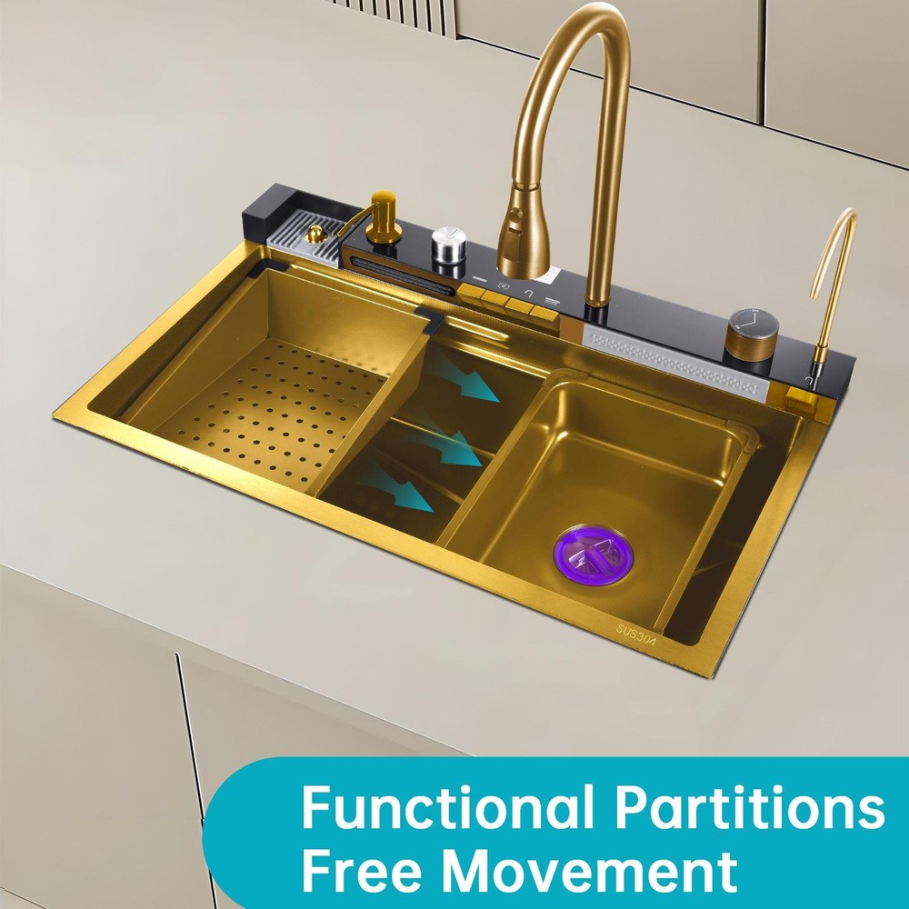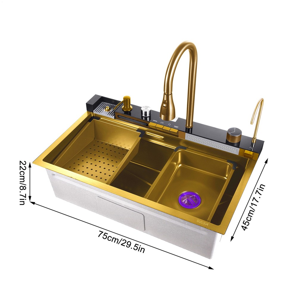FREE SHIPPING 30 DAYS GUARANTEE PREMIUM QUALITY GOOD SERVICE Description Bullet Points: Easy Integration: Recessed design of our top mount sink makes it simple to insert directly into the pre-cut hole on the countertop, delivering a mid-counter basin installation design that blends seamlessly with the surroundings for a polished look Innovative Design: Make dishwashing and vegetable preparation effortless with this top-mount kitchen sink's multi-function faucet. With a 360 pull-out faucet, three water spray modes, and an innovative waterfall design, this sink is ideal for any kitchen Excellent Durability: This kitchen sink top mount is built to last with its high-quality 304 stainless steel composition. Its nano-coating surfaces features long-lasting rust-proof performance while maintaining a bright appearance Modernized Maintenance: Utilizing a powerful high-pressure waterflow, our top mount kitchen sink is easy maintenance. An efficient cup washer simplifies cup cleaning, while a one-touch control drain button allows for effortless drainage Flexible Use: Designed for versatility, this top-mount kitchen sink is ideal for bar counters, kitchens, laundry rooms, outdoors, and public areas, including basic accessories for all settings This kitchen sink drop in is easy to install directly into pre-cut countertop holes and features easy dish and veggie washing. With rust-proof construction and easy maintenance, it's perfect for a variety of settings. Specifications: Product name: kitchen sink top mount Product color: Gold Product size: Sink size: 750x450x220mm/29.5x17.7x8.66in Inner diameter: 700x350x220mm/27.5x13.7x8.66in Outer diameter of drain hole: 110mm/4.33in Inner diameter of drain: 90mm/3.54in Drain pipe diameter: 45mm/1.77in Sink material: 304 SUS stainless steel Sink thickness: panel 3mm/0.11in Pipe: 0.8mm/0.03in Packing list: Basin x1 Drainer x1 Drain pipe x1 Bin in basin x1 Chopping board x1 Stainless steel whale faucet x1 Angle valve x2 Hot and cold hose x2 Table control drain x1 Triangular drain basket x1 Notes: 1. Due to different lighting and screen settings, the item color may be slightly different from the picture. 2. Due to different manual measurements, please allow a 1-2cm difference in size. SHIPPING 1. The shipping rates listed are only for residential or commercial destinations in the continental 48 United States. All international sales will go through eBay Global Shipping Program.please ask us if there are any questions. 2. We only ship the item to the address that is sent to us at the time of checkout. Please verify the correct shipping address in your PayPal account before making your payment. If we ship your item to an old or invalid address and you are not able to locate the item, we are not responsible for shipping a replacement. 3. Currently, we do not ship to Hawaii, Alaska, Puerto Rico,APO/FPO/PO Boxes. 4. We use USPS & FedEx as shipping method. PAYMENT 1. We accept PayPal and all forms of credit card. 2. We will only ship to the confirmed Paypal shipping address given with the payment.responsible for shipping a replacement. 3. We do not offer local pick up service. RETURN 1. 30 days Money Back Guarantee. All of our products come with a return period of 30 days from the date of original delivery. 2. If any package that needs to be returned, please contact our customer service first to receive a RMA form. 3. All return items MUST be in brand new condition. 4. If you are not completely satisfied with your purchase or no longer need the item (if unopened) within the 30 days, we will assist you with a return for full refund minus a 20% processing fee. 5. If there is an issue of damage, please send us pictures through mail. Depending on the damage, we will take further action to solve the problem as soon as possible. 6. Please do not ship any goods to any address without our authorisation as it might lead to you not receiving your refund. [Please do not initiate a return without our authorisation as this could result in a delay in issuing your refund.