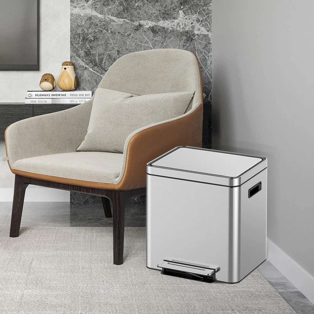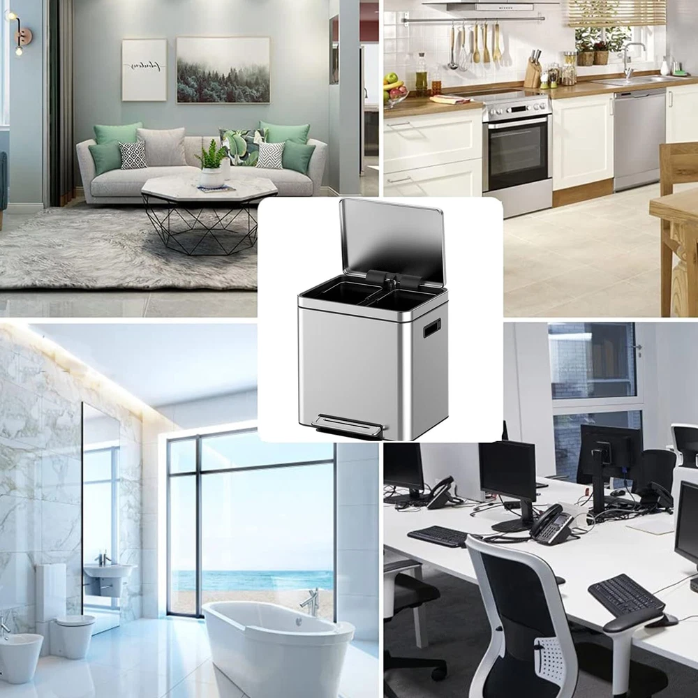 **Product Features:** - **Hands-Free Kitchen Step Trash Can:** Enjoy the convenience of a hands-free operation with the step foot pedal, allowing you to dispose of waste without touching the can. - **Metal Lid & Step Foot Pedal:** The sturdy metal lid and step foot pedal ensure durability and ease of use, providing a seamless experience every time. - **Double Compartment Classified Rubbish Bin With Removable Inner Bucket:** The dual compartments, each with a 15L capacity, make it simple to separate trash and recycling. The removable inner buckets allow for easy cleaning and emptying. **Product Details:** - **Durable and Long-lasting:** Crafted from high-quality stainless steel, this kitchen garbage can is built to withstand daily use. It resists scratches, dents, and other wear and tear, ensuring it remains a long-lasting addition to your home. - **Dual Compartments:** The 2 inner buckets are perfect for separating waste and recycling, keeping your kitchen tidy and organized. - **Convenient and Practical:** The foot pedal and soft-close lid make this garbage can both convenient and practical. Dispose of your waste effortlessly while the soft-close lid contains odors and mess. - **Easy to Clean and Maintain:** The smooth stainless steel finish makes cleaning a breeze. Simply wipe it down with a damp cloth to keep it looking as good as new. The inner buckets can be easily removed for thorough cleaning and emptying. - **Versatile:** This garbage can is not only ideal for the kitchen but also suitable for bedrooms, living rooms, offices, hotels, and even outdoor spaces like patios, decks, and gardens. Hands-Free Convenience: Enjoy a hands-free experience with the step trash can. Equipped with a step foot pedal to dispose waste without ever having to touch the lid. Perfect for busy kitchens and households. Sturdy Metal Lid: This stainless steel kitchen trash can comes with a sturdy metal lid, ensuring durability and a sleek, modern look. The silver finish adds a touch of elegance to any kitchen or bathroom space. Dual Compartments: Stay organized with our double garbage cans for kitchen. The dual compartments allow you to separate trash and recyclables effortlessly, making it a versatile addition to any home. Removable Inner Buckets: Cleaning is a breeze with the removable inner buckets. Simply lift out each compartment to empty and clean, ensuring your silver trash can with metal lid stays pristine. High-Quality Stainless Steel: Crafted from premium stainless steel, this step trash can is built to withstand daily use. The stainless steel construction resists scratches, dents and wear, ensuring your trash can looks great for years to come.