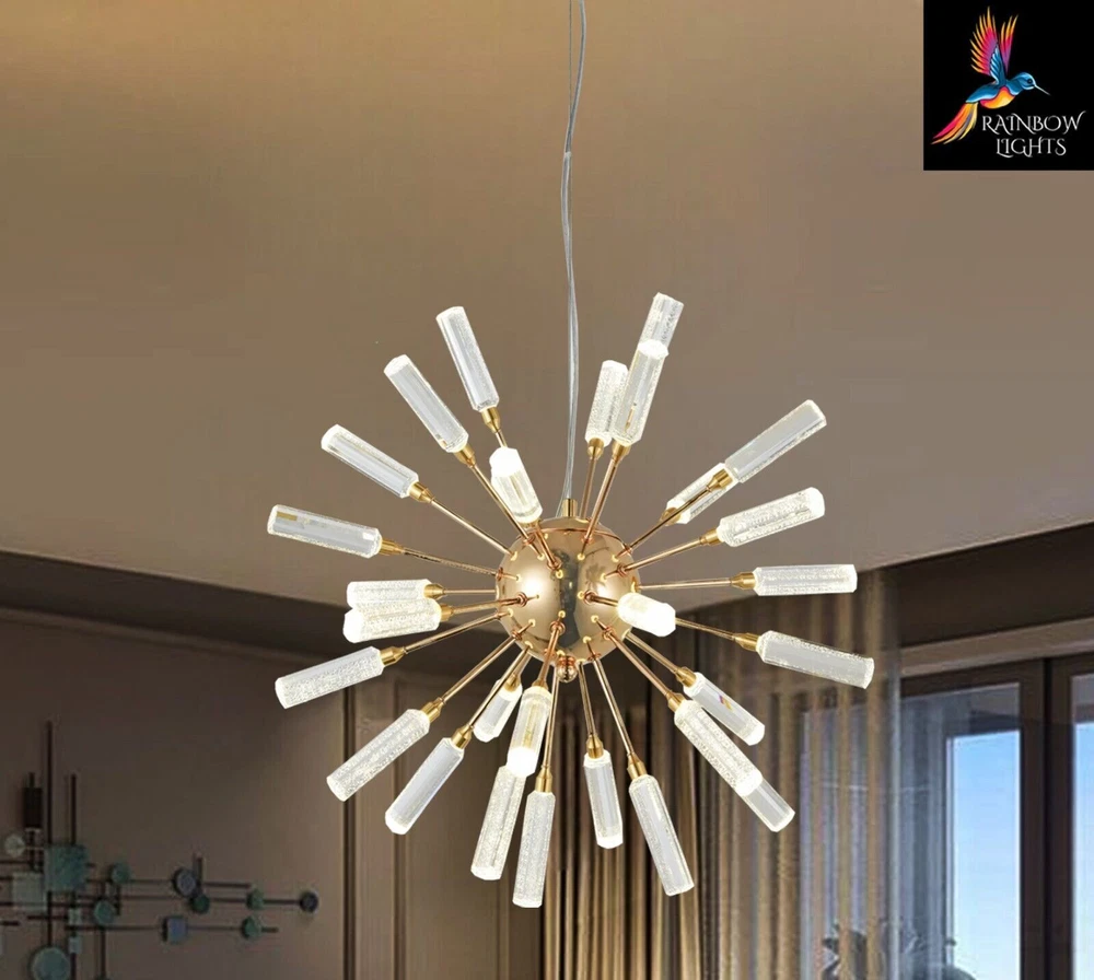 Introducing the Starburst Style Seeded Crystal Stick Sputnik Chandelier, an exquisite addition to your home decor from Rainbow Lights. The Starburst Sputnik chandelier is a unique and timeless lighting fixture, characterized by its striking design featuring multiple arms radiating from a central sphere, reminiscent of a starburst or satellite. Available in a variety of designs, sizes, and finishes such as chrome, brass, and bronze, these chandeliers complement a diverse array of interior styles. Their bold and dynamic appearance serves as a focal point in any space, including living rooms, dining areas, and entryways. Product Specifications: Condition: NEW Material: Crystal and metal Width/Diameter: 50 cm Height: Adjustable Product Type: Sputnik Light Style: Contemporary Number of Bulbs: 30 Bulb Type: LED Voltage: AC110-240V - 50/60Hz Lumens: 80-100 CCT (Color Temperature): Clear Light Source: LED Shade: 3000K (Warm White) Specific Uses: Indoor Weight: 6.6 kg Please note that the bulb is not included in the package. Crystal Chandelier Lighting - Crystal Pendant Lighting - Kitchen island Hanging Light - Dining room Pendant Light - Foyer Chandelier lighting - Bedroom Pendant light Listing and template services provided by inkFrog