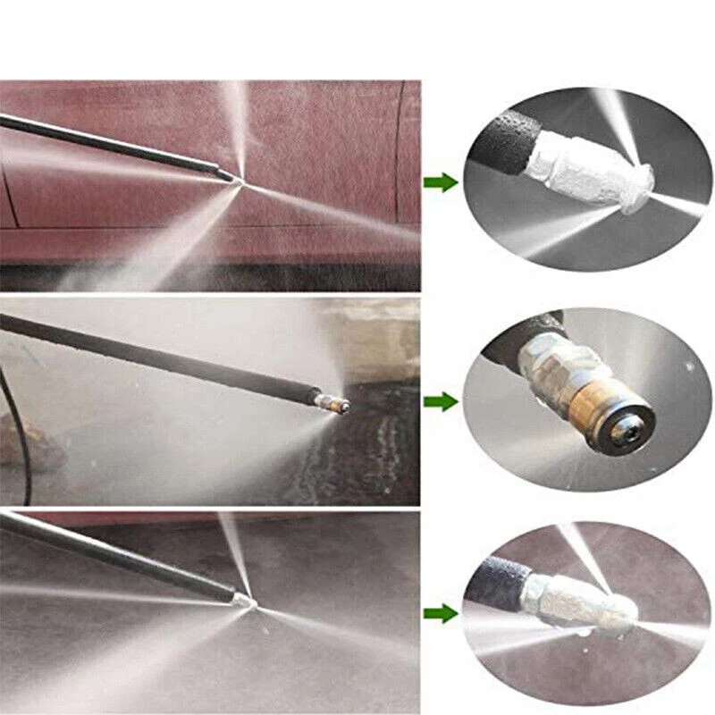 Description: Sewer Jetter parts for Pressure Washer can help you unblock More types of indoor and outdoor drainage devices, combined with any brand of pressure washer, can easily flush obstructions. Durable Sewer Jetting Hose - Inner tube is made of thermoplastic polyester, which provides strong toughness .Reinforcement layer is 1/4" high tenacity polyester textile braid to protect water pipes from explosion. Button Nose and Rotating Nozzle - Button Nose 4.0 Orifice.1 front jet at 0°that clears blockages.3 rear jets at 33° flush out debris loosened by the front jet.1/4" Female Fitting - Fits 1/4" NPT male sewer jet hose fittings.Rotating Sewer Jetter Nozzle 3 backward rotating spray blasts into clogged pipe and moves the nozzle through pipe. The nozzle is easy to slide into drain pipes and sewer lines. Quick Connect Plug and Female Metric M22 to 1/4 Inch Female Npt Fitting - Quick Connect Plug used in a lot of situations where high pressure connections are frequently assembled or disassembled.For quick exchange of pressure washer outlet, sewer jetter hose, guns and nozzles.It makes a solid connection with quick coupler each time.Pressure washer coupler convert metric M22 14mm female NPT thread to 1/4" Female NPT. Specification: Temperature Range:-40°F/+160°F Working pressure : 1200PSI to 1600PSI Max Working Pressure:5800PSI(40MPa) Package Includes: 1 Piece Sewer Jet Hose(15/30m) 1 Piece Mushroom Nose Nozzle 1 Piece Rotating Sewer Jet Nozzle 1 Piece Button Nose Sewer Jetter Nozzle 1 Piece Coupler (female M22 to female M14 NPT) 1 Piece 1/4" Quick Disconnect Plug 1 Piece Connector For Karcher 1 Piece Connector For Lavor 2 Pieces wrench 1 Roll Waterproof Tape 20 Pieces Needles